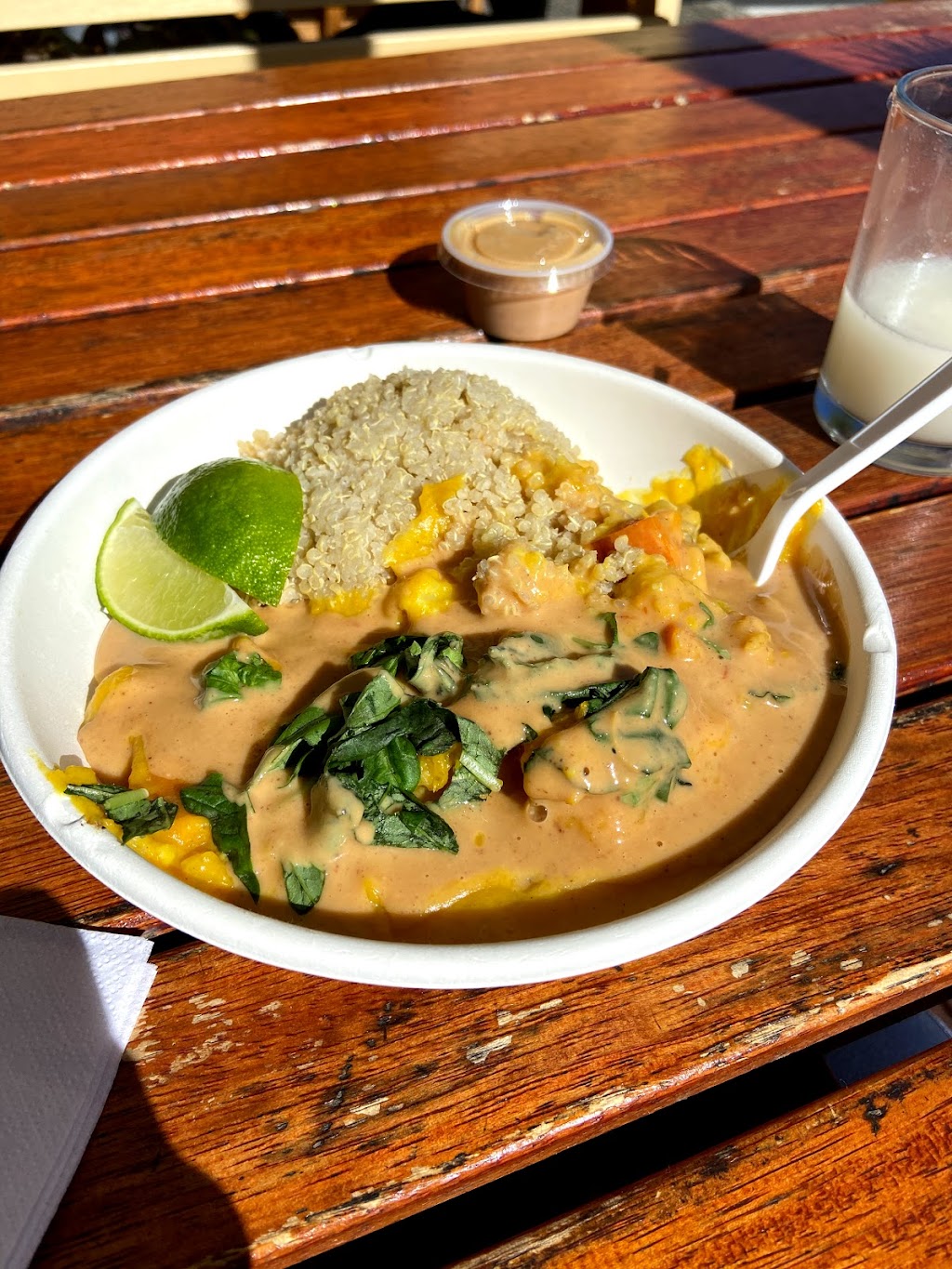 The food is straight up delicious. We had a ginger/carrot/coconut soup, a dahl, and a bowl with 3 sauces and all were full of flavor and noticeably made with fresh ingredients. The owners and manager (Sage) are delightful people who prioritize the quality of their meals, and it shows in how much we enjoyed our own dishes.