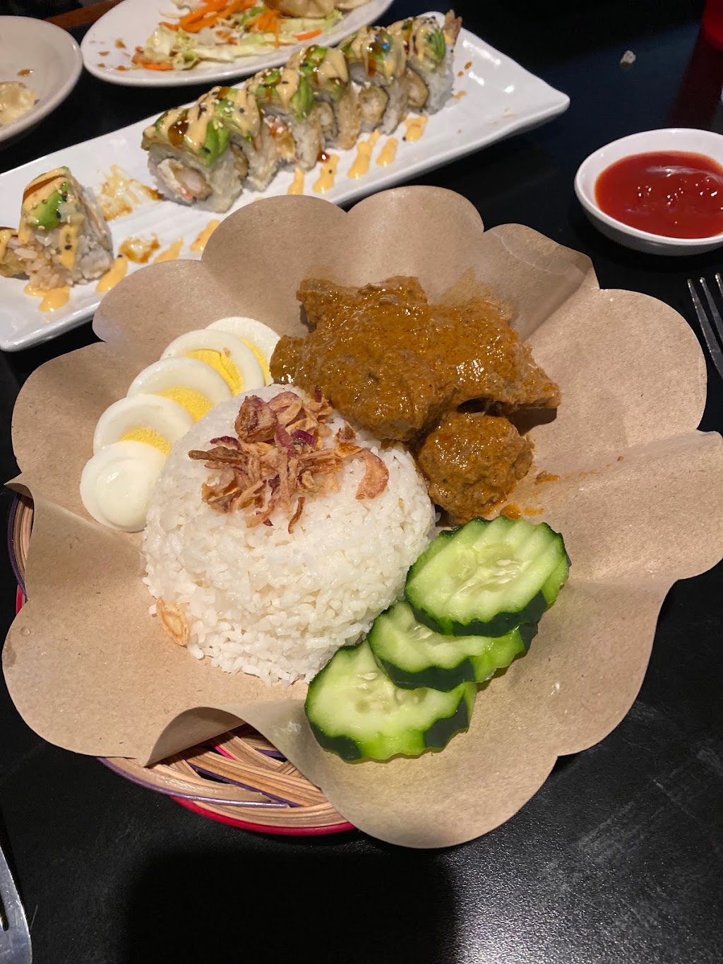 We ordered the Kaleidoscope, Volcano and Caterpillar sushi rolls. And also some Indonesian rendang, which they didn’t have at their restaurant in Brookings