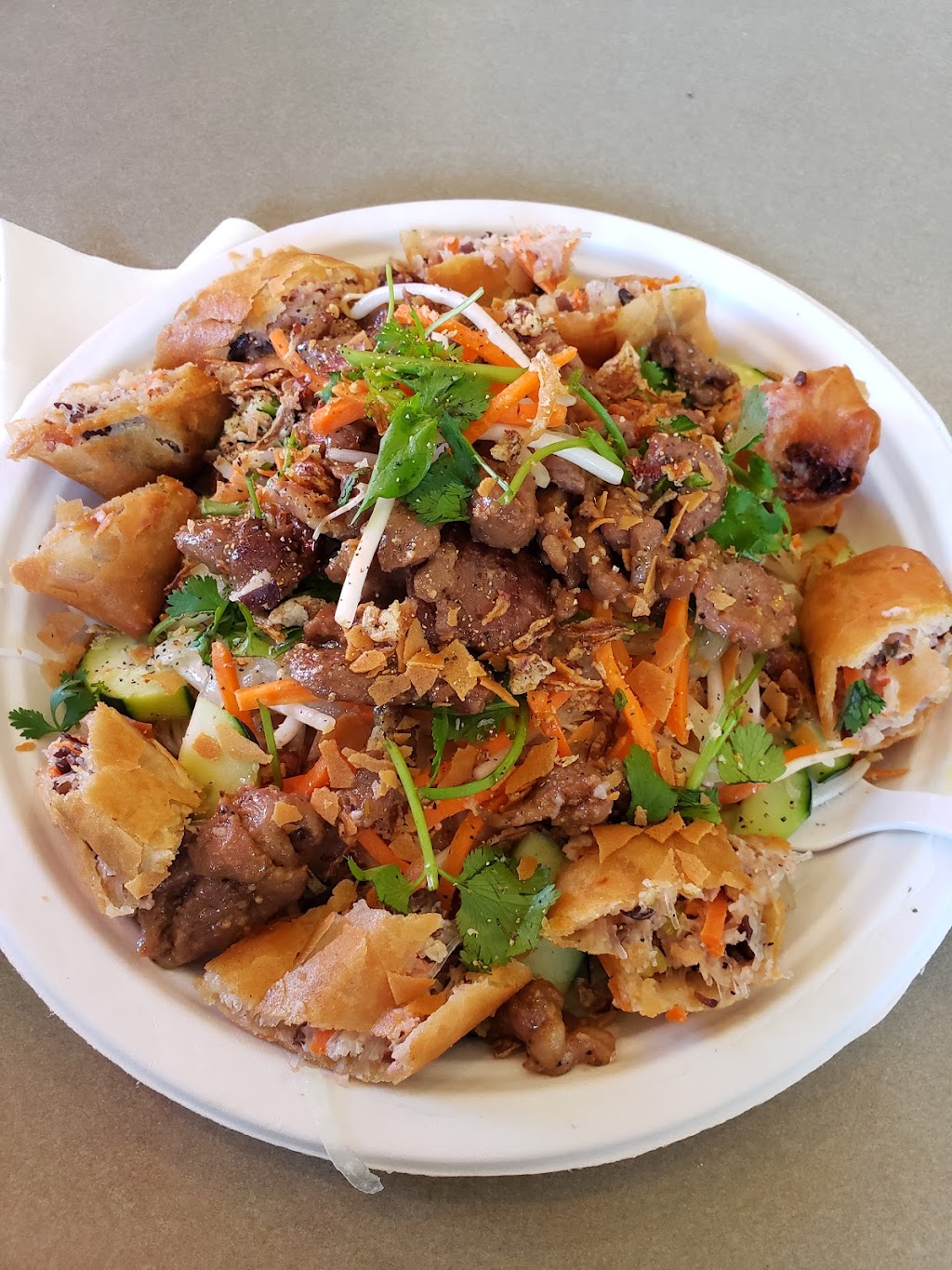 I ordered Bánh Mì, combo plus, and spring rolls. Bánh mì with beef is consisted of lemongrass beef with white sauce (tasted similar to mayo), cabbage, lots of yellow onion, which is not traditional way of making Bánh Mì. This is more westernized Bánh Mì. Combo plus is 3 kinds of grilled meat (tumeric chicken, some kind of marinated pork, and lemomgrass beef) and cabbage salad on a bed of rice. My kids love traditional spring rolls but did not eat the spring rolls after one bite. Dipping sauce is spicy. I expected a little more authentic Vietnamese food at this restaurant but totally disappointed. The posted pictures of the food look good but do not taste good.