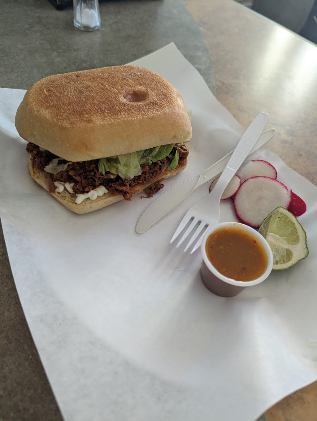 Great service. One nice man was running the whole place and did great. Food was delicious. I had a carnitas torta that was delicious and a good size although it was so good I almost wanted more. Birria quesadillas were great and big. My son got a asada burrito that was as good as expected. Would definitely stop by again when we drive by (driving from California).