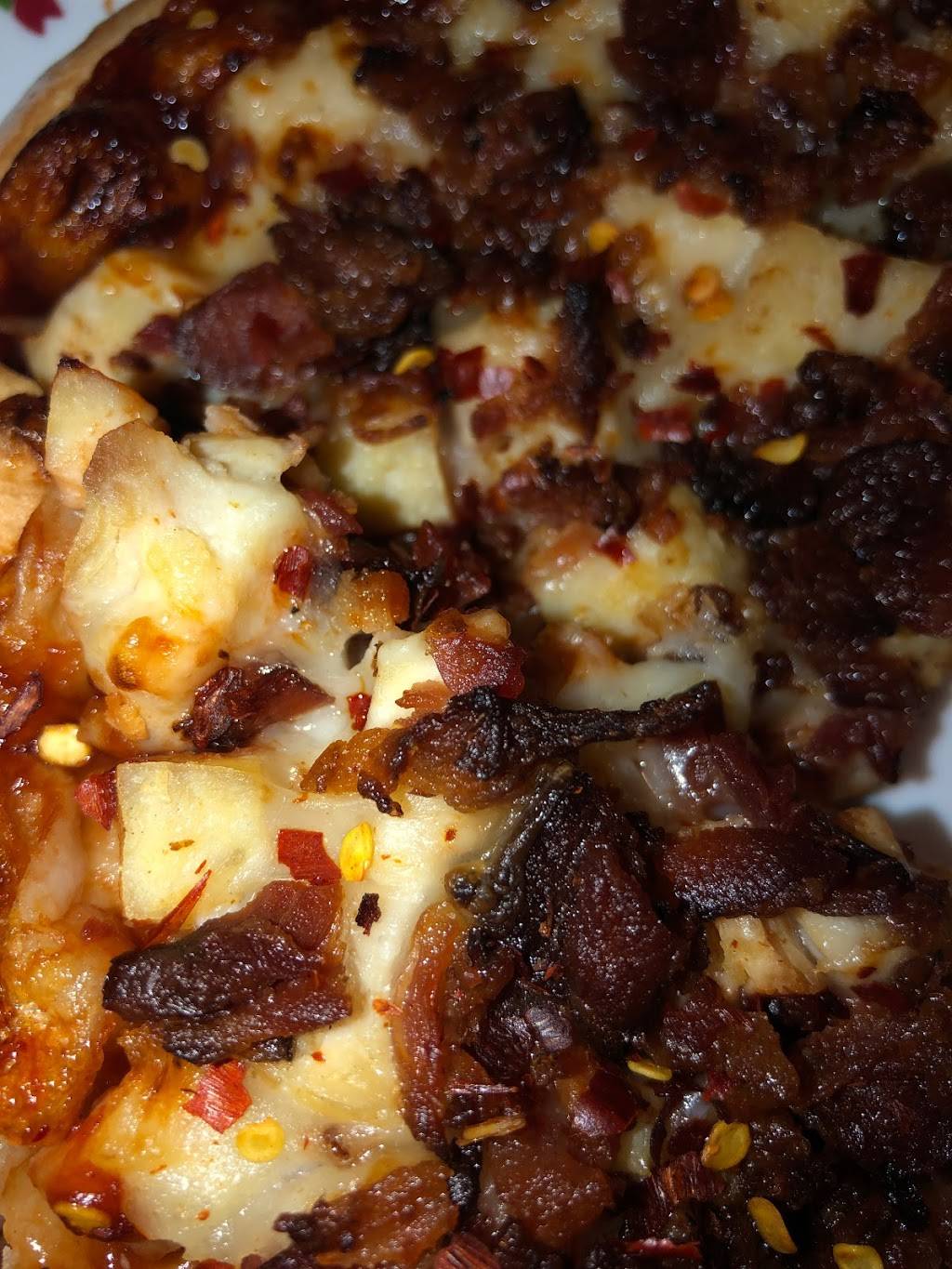 Normally it’s my favorite place to order pizza because I love their crust so much but tonight I couldn’t even finish my personal size pizza. The crust was so chewy and tough, and the bacon bits were burnt to a crisp, and the chicken was chewy as well. Very disappointing dinner ????