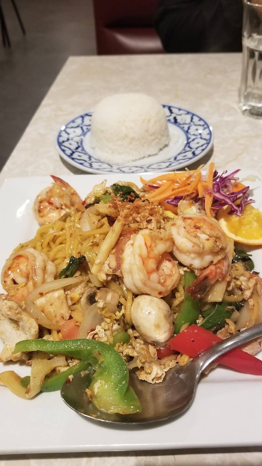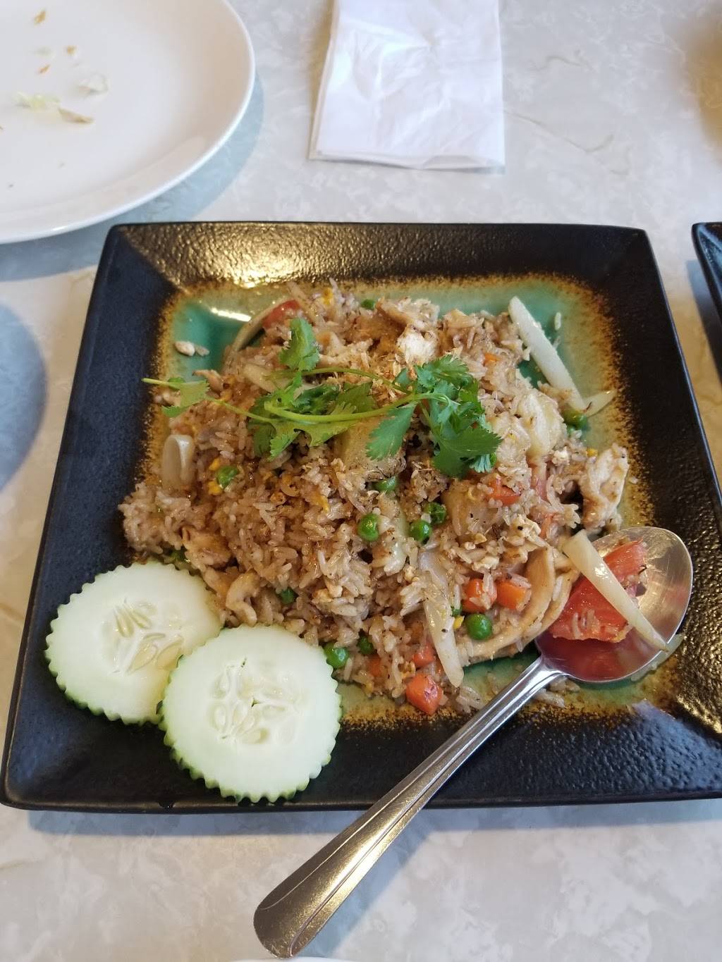 Tasty thai food. Ordered the chicken cashew stir fry and seafood combo tomyam. Medium hot is hot enough for me without burning through the tongue. Taste of the dishes are more on the sweet side of thai food. Best for group so that you can order more variety. Portion is too big for me (any restaurant in us for that matter), wish they have smaller portion so i can order more dishes.