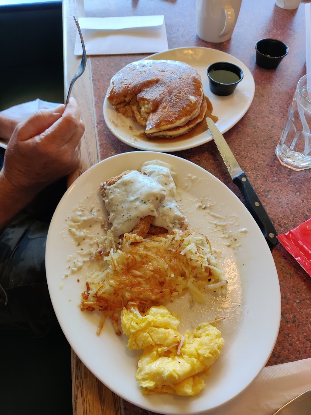 We ordered the Country Fried Steak breakfast and it was incredible. Everything was cooked perfectly and the portion was huge. The country fried steak was delicious with a good gravy and not greasy. The scrambled eggs, hash browns, and pancakes all had a good flavor. My husband and I shared the breakfast and could barely finish it. We were stuffed for the day. We were visiting with an Aunt we hadn't seen in 40 years. She had a burger and fries and said they were delicious. She took half of hers home. After seeing some of the negative reviews, we were doubtful; but can honestly say we had a great meal. The waitress didn't refill my water glass so I drank everyone else's water since they had other drinks, but I think she was trying not to disturb us. When we were leaving, I forgot my Wet Ones on the table and she came outside to give them to me. So nice of her. That definitely makes up for not refilling the water glass.