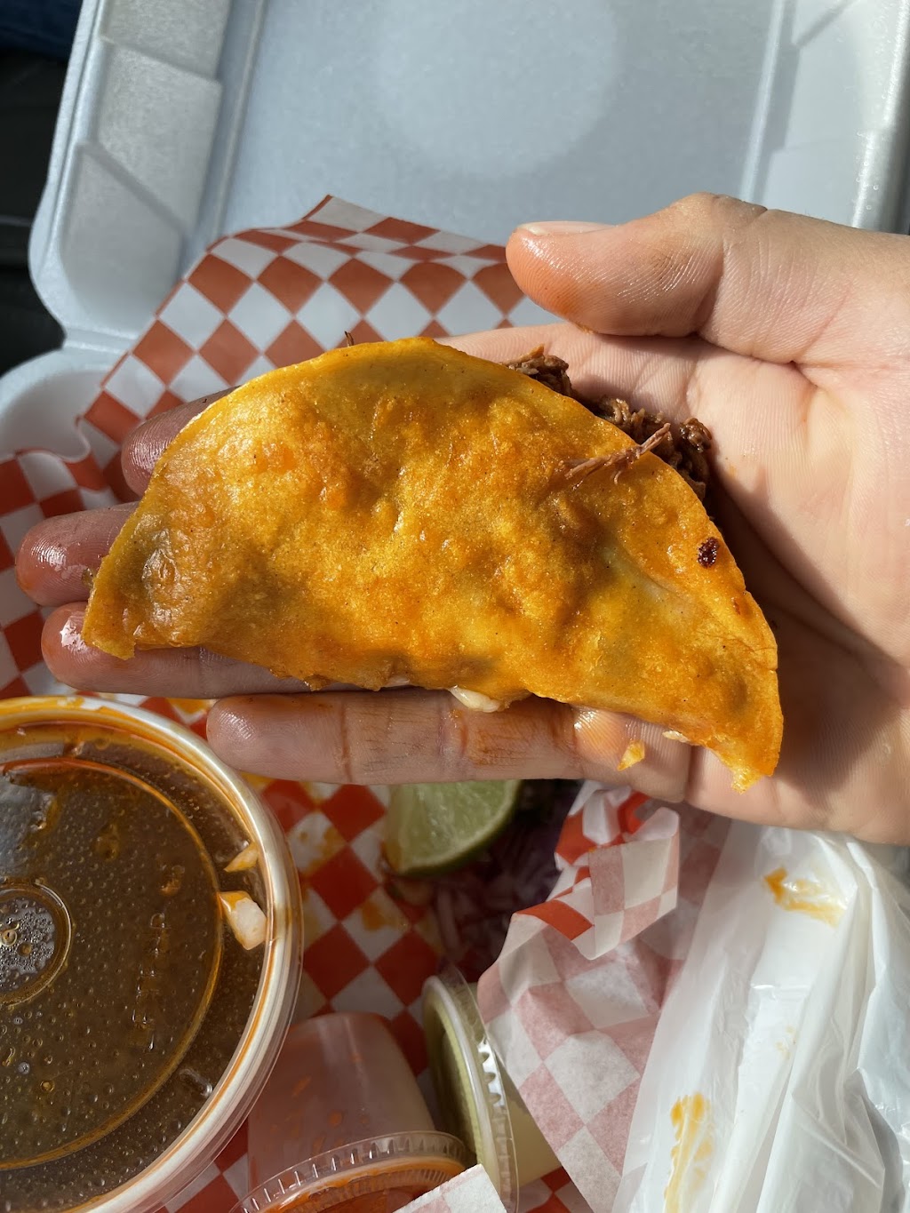 What a great find. We got the birria burrito, and was not disappointed. Lots of tender flavorful pork. Just a Lil rice. And something I've never had before was cheese on it. Believe it's a mozzarella, but surprisingly good on the burrito. Had half for lunch and half for dinner. It was a big burrito. Tortilla had a nice exterior crunch. I'll be back for sure. Oh, the watermelon water was very refreshing and went well with the meal. The green sauce had a creamy avocado taste. The red of course was the heat bringer.