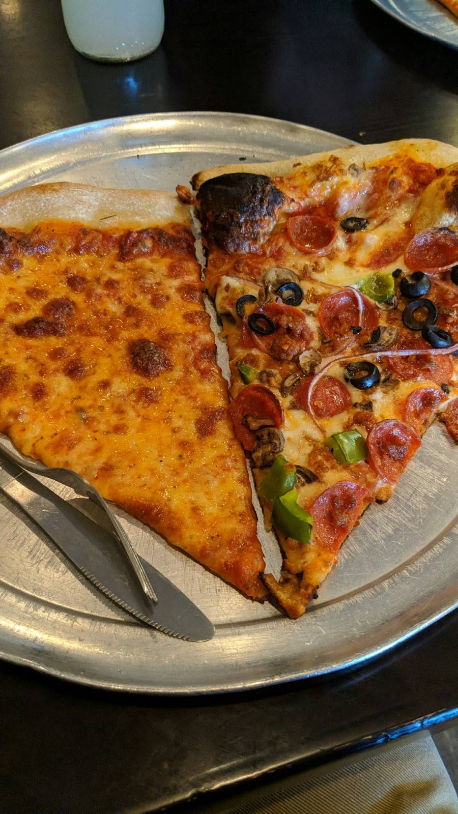 Huge slices of pizza, and delicious garlic bread. The pizzas fresh made and ready to be eaten and either a dine-in or take out scenario. I had the spinach and mushroom pizza and plain cheese. Two slices and I was full.