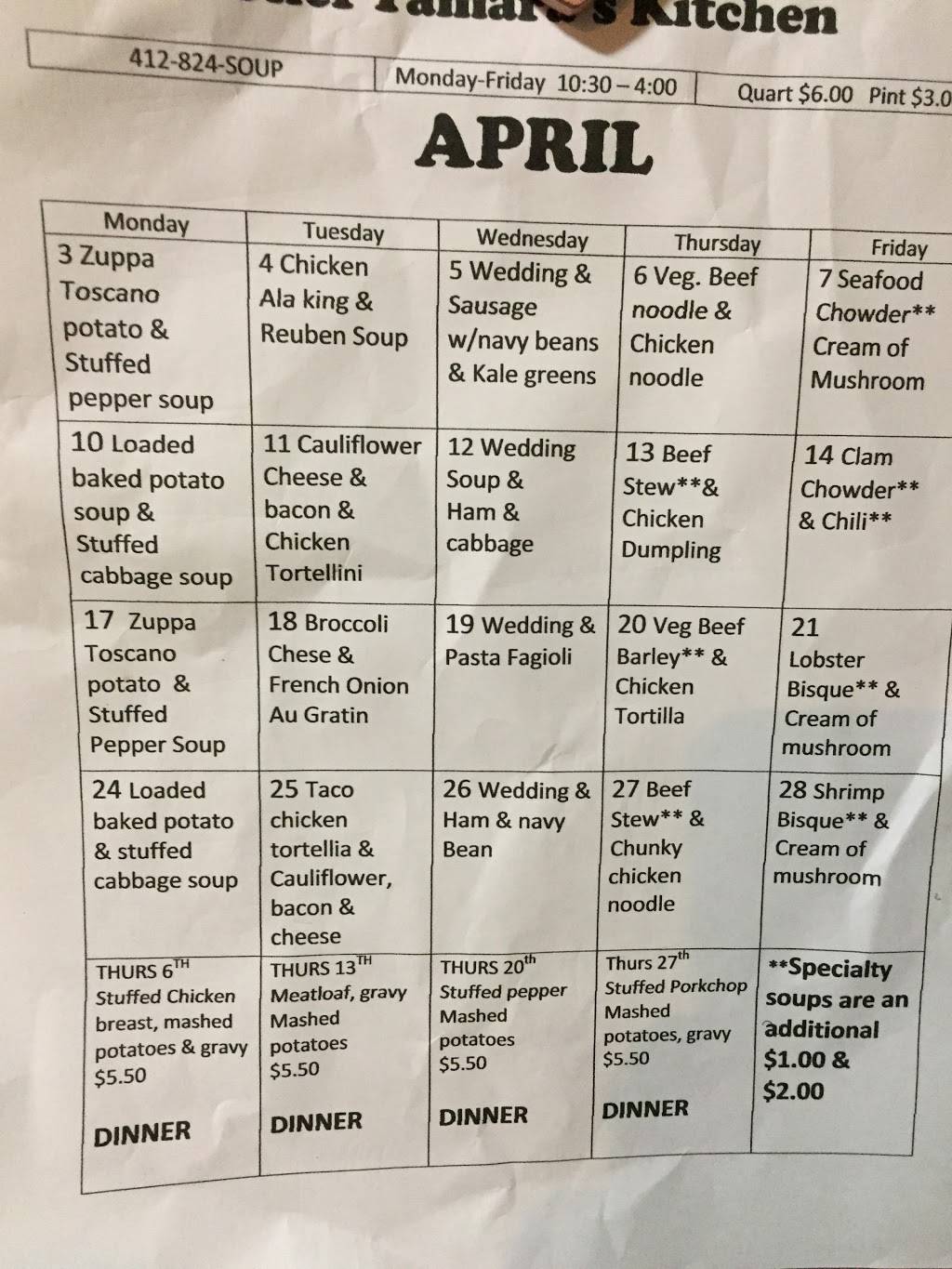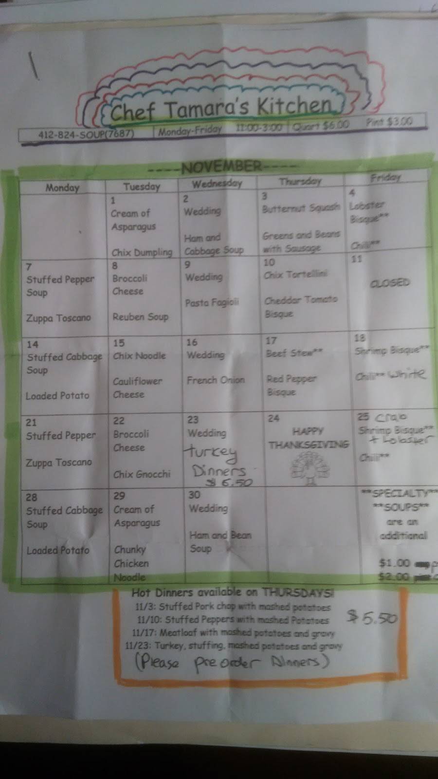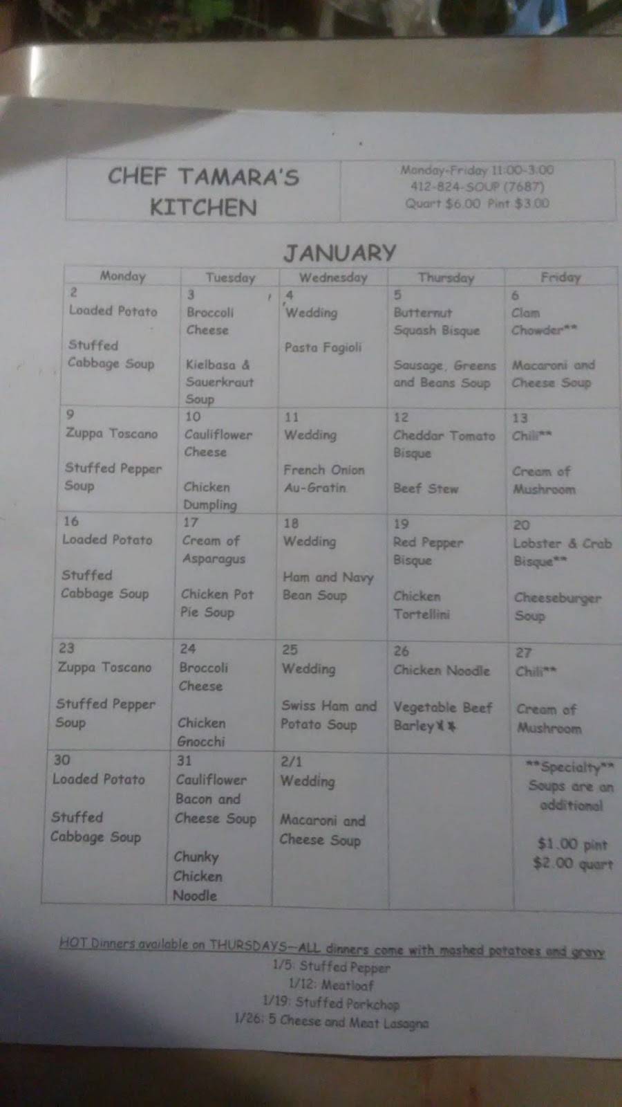 I've been frequenting Chef T's for 6 months- since I was turned on to her place by a good friend. Just when I think it can't get any better, I try a different soup and it gets more spectacular. The wedding soup is top notch- but my personal favorite is the cheddar tomato bisque! No matter how busy, Tammy surely knows how to keep us laughing and coming back for more with upcoming menus for the month. I can never resist the cookies on my way out...and I make sure to place my orders for the week! Thanks Tammy for being great at what you do and making your patrons smile!
