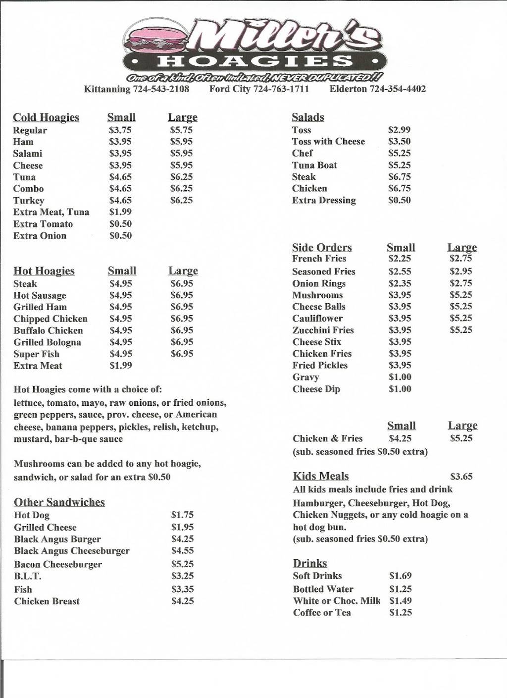 Best Hoagies ever. Great service. Excellent staff. Nothing beats a Miller's original Hoagie. There are 3 locations Ford City, Kittanning, and Elderton all in Western Pennsylvania. If you're ever in that area you must stop and get a hoagie.