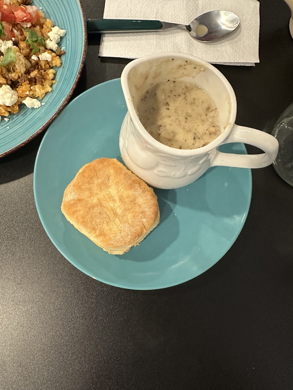 We ordered a little of everything to try it out and everything was yummy. The Chorizo Hash was full of flavor and potatoes were nice and crunchy. The Bacon & Cheese Omelet was really good, which you think wouldn't be difficult but many other places can't seem to make good omelets...in my opinion. We also got a side pancake and a side biscuit with gravy. The biscuit was delicious! The pancake had great flavor and I enjoyed the crispy edge and the hot syrup.