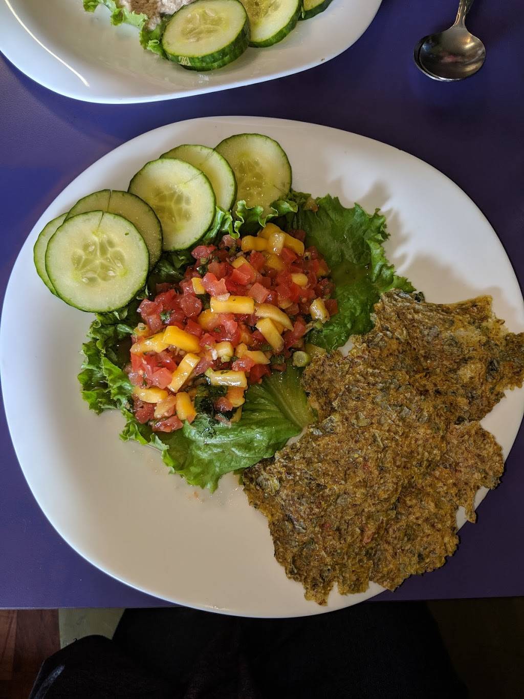 I got the salsa with fresh veggie chips & taco wrap. The salsa was so fresh & bright with flavor. My main meal was to die for as well as the lemonade.