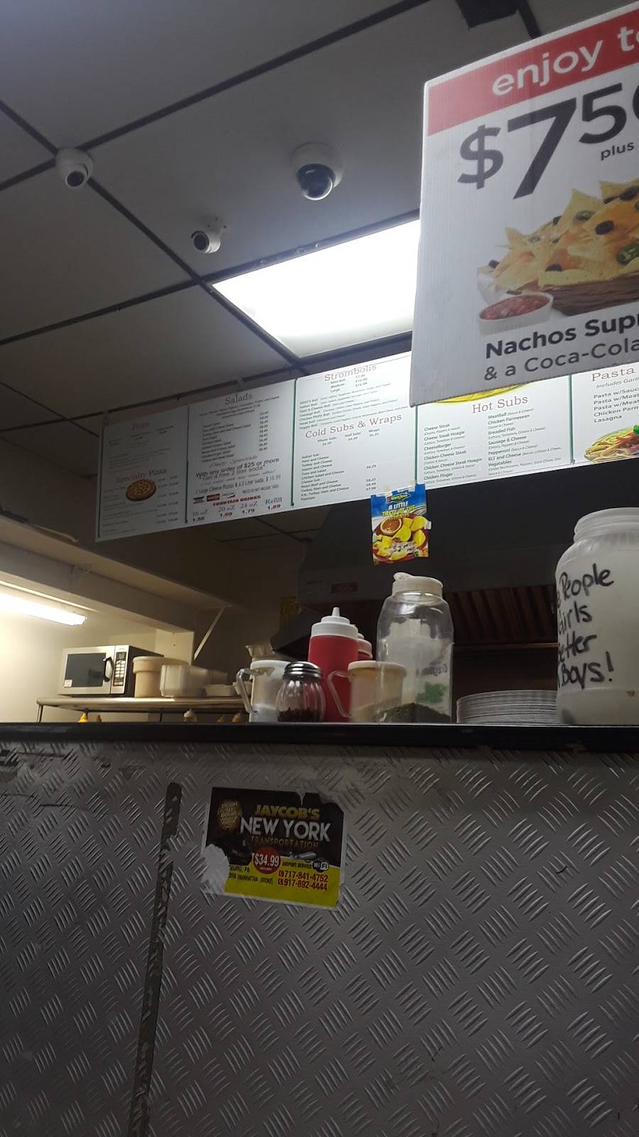 Variety of breakfast , launch & dinner meals I love their pizza, Stromboli’s & the steak sub is amazing