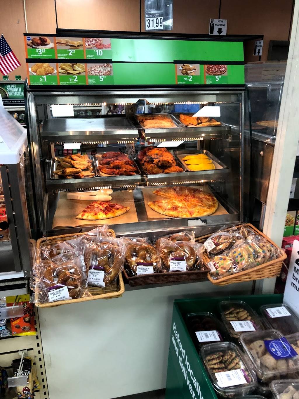 I do not think they have a public restroom. I've never actually asked, but it's a small store. They don't carry a large variety of items, but the people are nice and I seem to pick up my sodas or juices. They have pizza, chicken on a stick, they have hot dogs, slurpees, potato chips candy pretzels that kind of thing ... A small fruit section... some rolls of toilet paper, Pepto-Bismol painkillers...and milk, bread and cereal. what's often not so convenient is they have a banking machine which is often out for up to a month or more at a time so before you stop to get cash back in this store I would recommend you go to Wawa you can also play the numbers here but who doesn't know that. Just make sure that when you check out you know what you're being charged because most items don't have prices on and it can often vary from what you look at on a tag such as Gatorade I brought a Gatorade one day I think it was supposed to be a dollar 89 and I was charged 289 but I didn't know that till I got home and looked at the receipt.