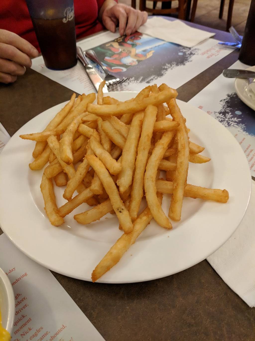 The atmosphere is nice. The restaurant is clean and the staff is very friendly. The prices are middle ground, a little high. The portions are very large though. And the menu is HUGE, expect to take a while to decide, although that's to be expected at a 24hr diner serving breakfast all day.
