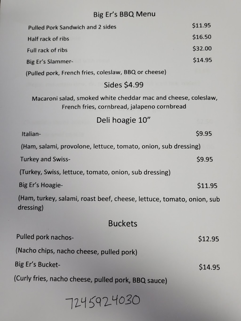 I had big er’s bucket (pulled pork, nacho cheese and bbq sauce over fries) AMAZING! Highly recommend!!! The ribs were delicious as well! My kids loved the chicken tenders and French fries. Got a lot of food for our money!