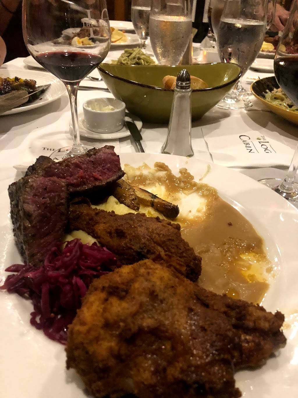 The atmosphere was warm and cozy like an old log cabin should be. Food was amazing, and service was just as good. Went their for wifes birthday and they had a small mansion jar with fresh flowers for her. I would highly recommend this place to anyone. Thank you log cabin and staff.