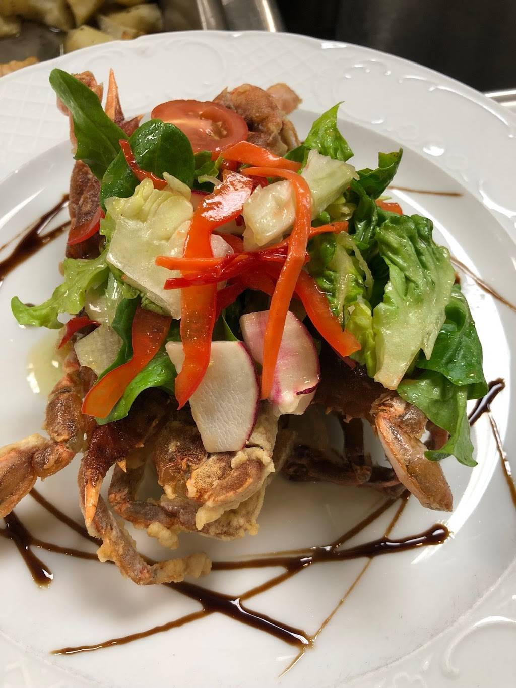 Inside this place looks like the classic example of italian fine dining. Fancy ornaments, white table clothes, gloved waiters, just small scale. The prices reflected that but luckily so did the taste. I had the lobster and crab black raviolin. It was delicious and I think it was the best of what our group ordered. The groups shared calimari was crisp and classic.