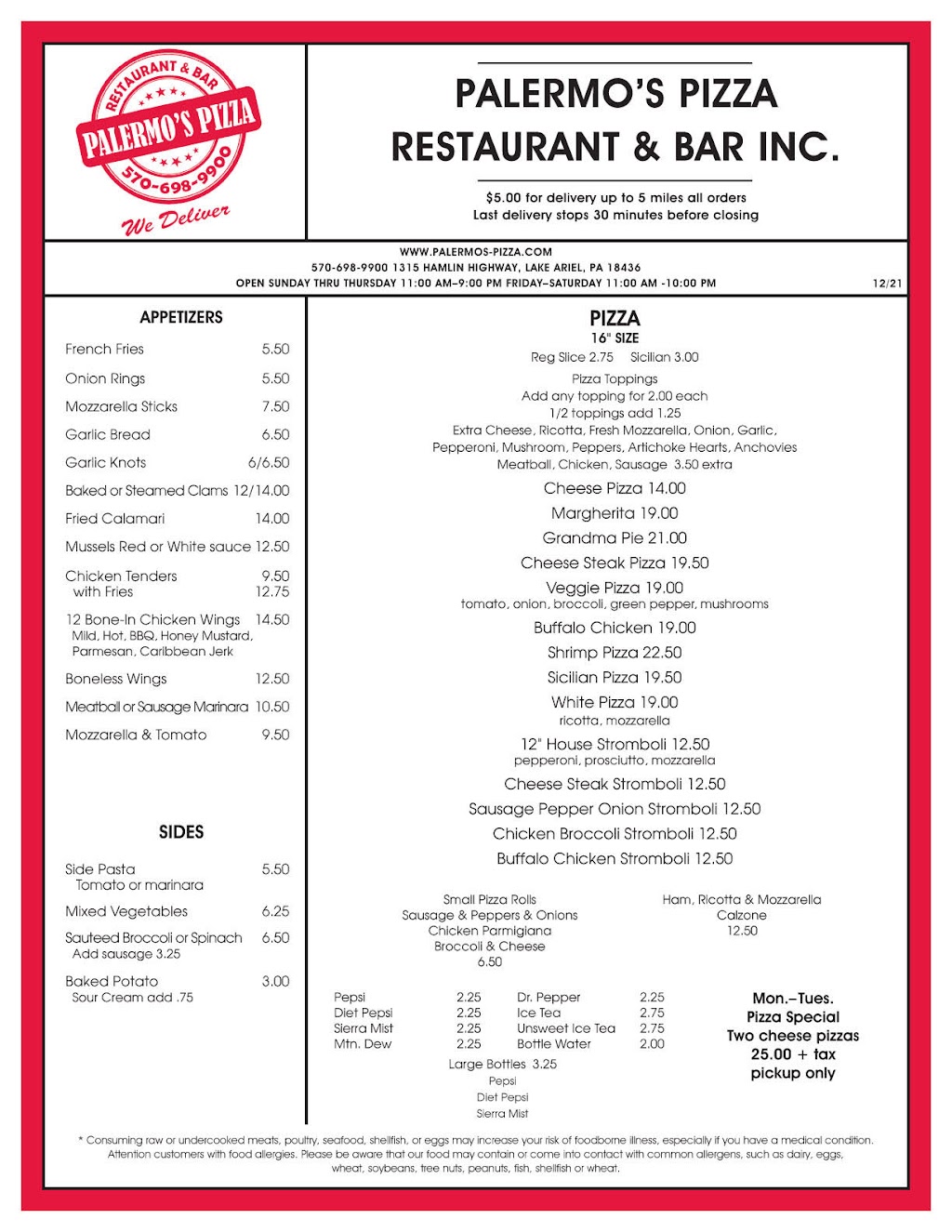 Ordered a Sicilian pizza for delivery. The Sicilian pie is the definitely the best value on the menu! Best sauce in the area, well cooked and the pie was delivered hot.