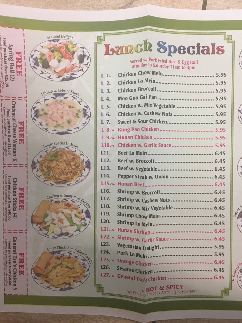 Great food in a local area! Price reasonable as well! Food is always nice warm and fresh! Always my go to Chinese takeout!!