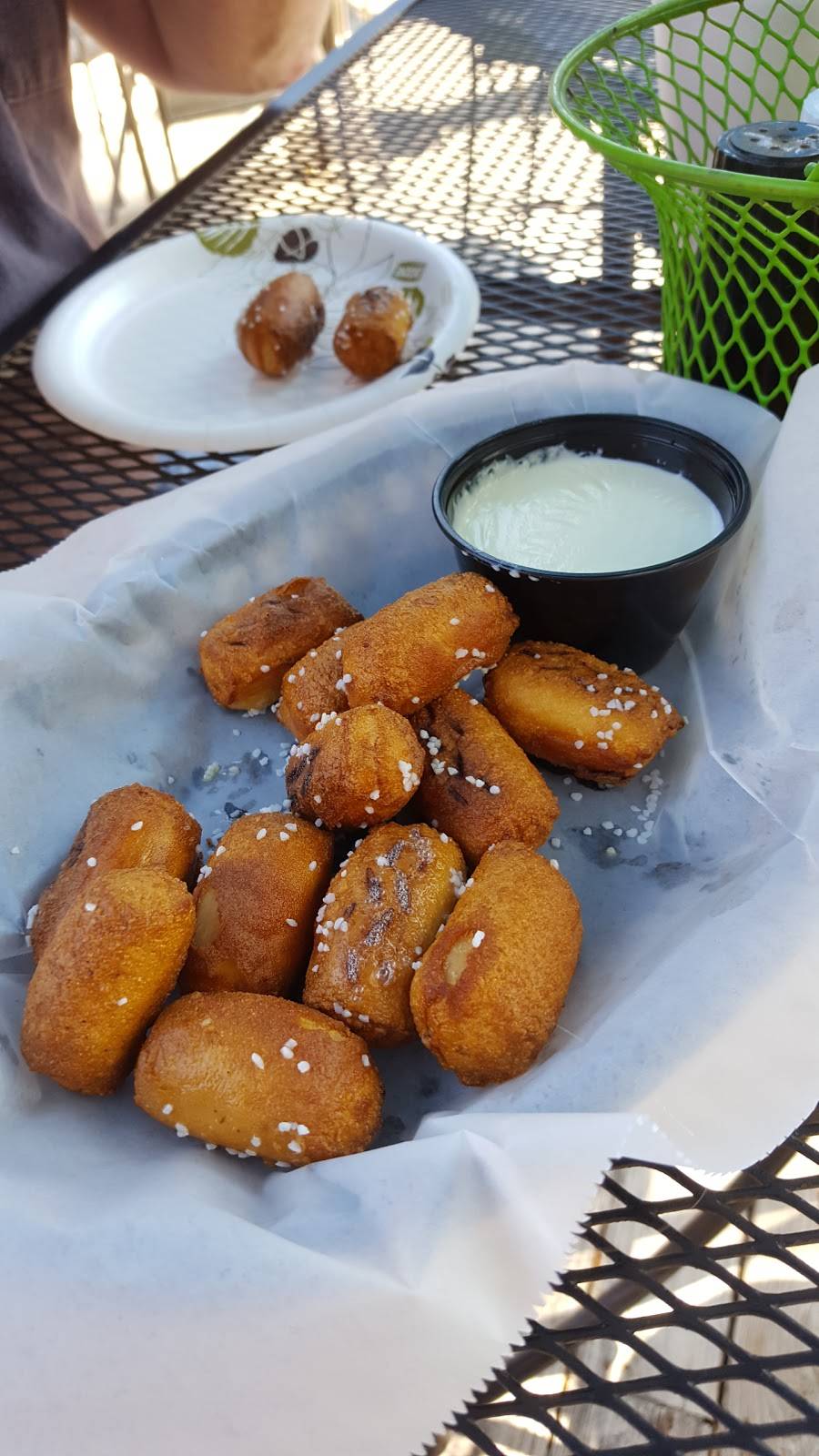 There were four of us out for a casual lunch. We were all happy with our food. The server was very sweet and friendly, and the food came quickly. We had a fun time, and weren't rushed to leave. We sat out on the shaded patio by the water, and with fans on, it was nice.