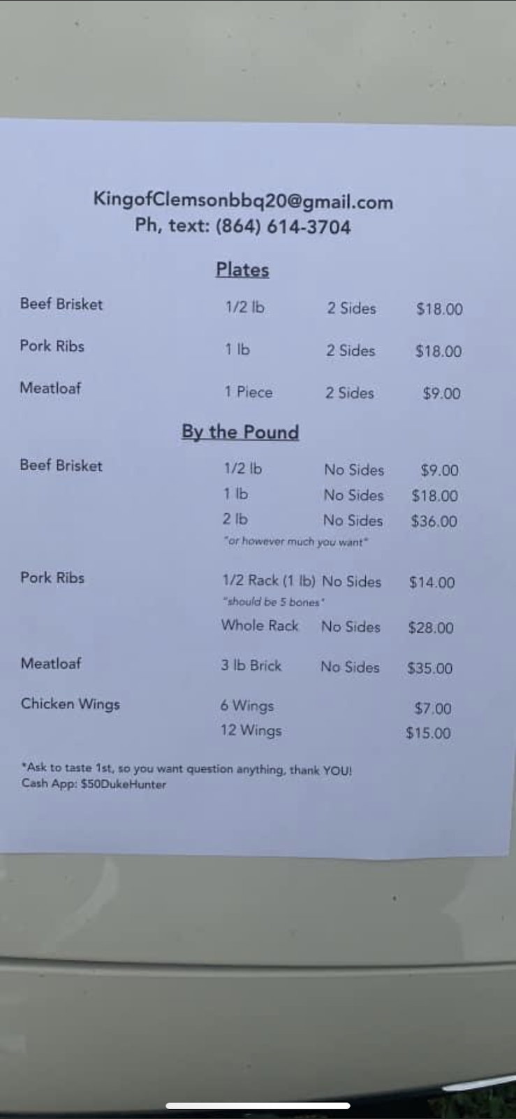 You can review this Business and help others by leaving a comment. If you want to share your thoughts about KingOfClemsonbbq, use the form below and your opinion, advice or comment will appear in this space.