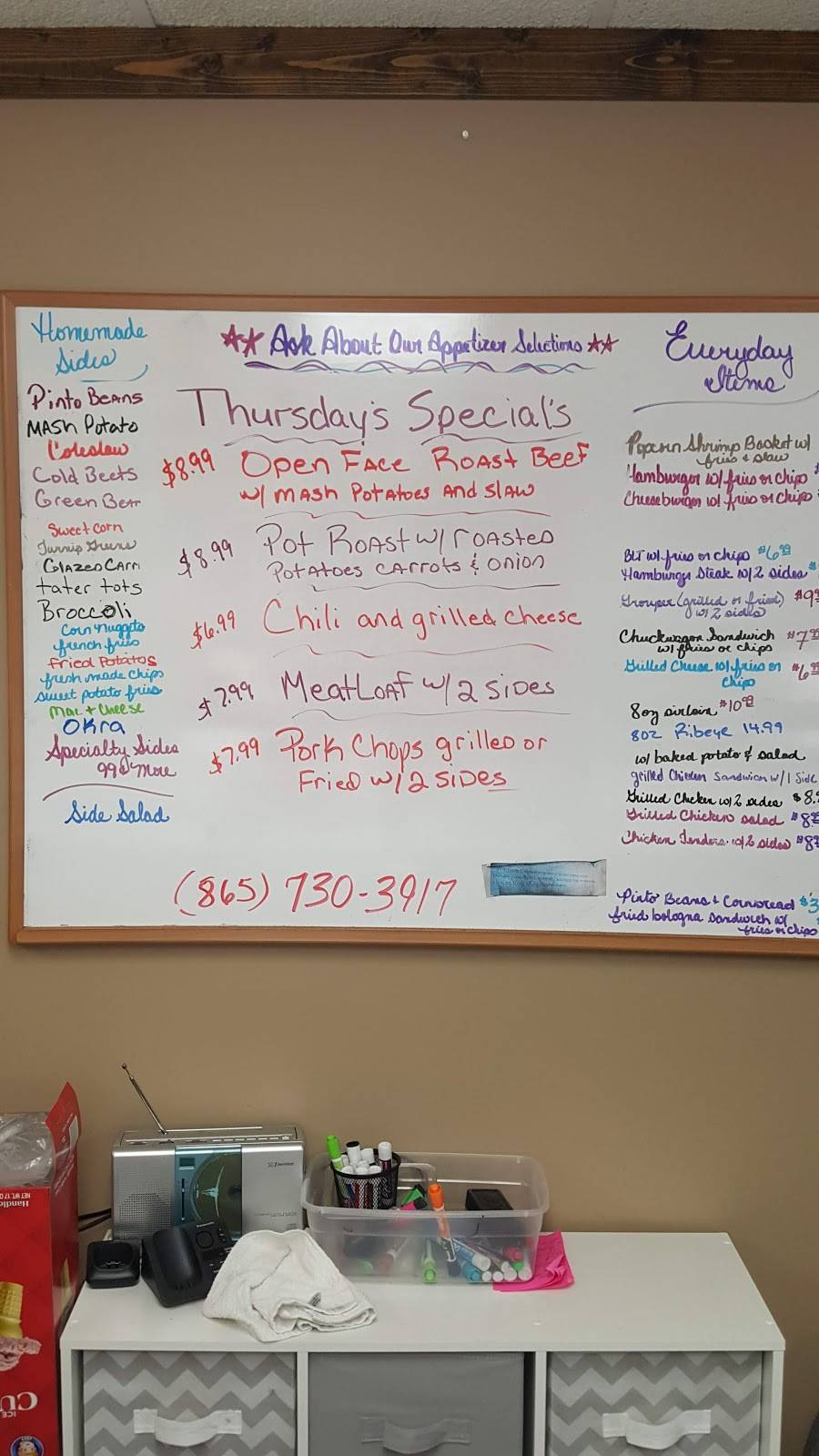 Good food. Good homespun service. Menu is on the white board when you walk in. Then you sit down when you know what you want. Coleslaw is good. Catfish is awesome. Prices are a little more than typical diner prices but not much more than other places. Be sure to ask about dessert bc I missed that opportunity.