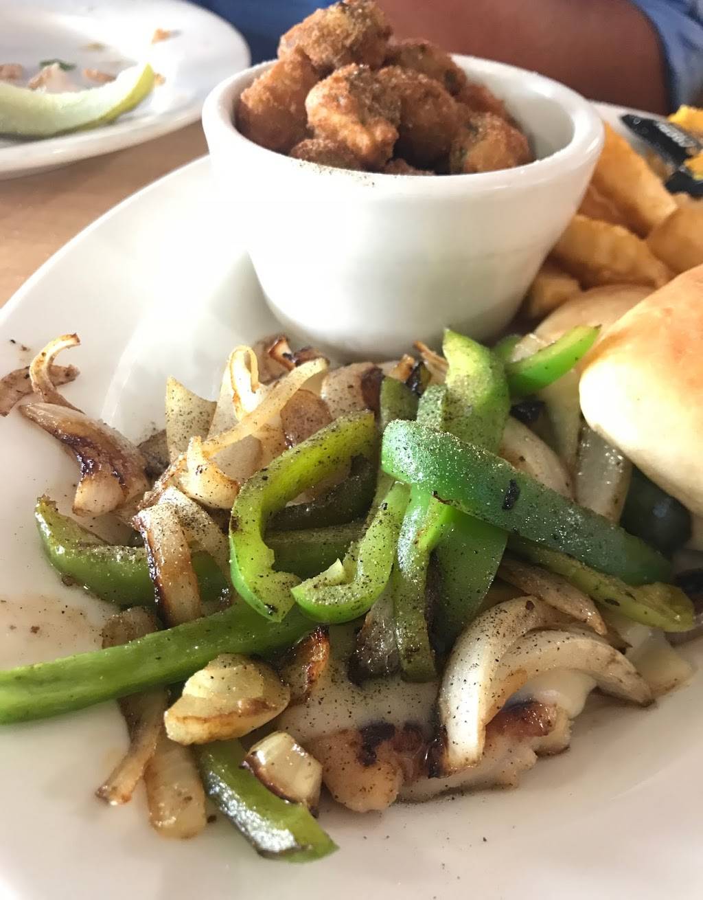 We both had cheeseburgers, and we really liked them. The hand-ground burgers were very tasty, and the crinkle-cut French fries and fried okra were nice and crisp. We sat outside to have a view of the water. All the burgers on the menu were less than $9 each. The waitress and rest of the staff were attentive and helpful, and if we're looking for a sit-down place for burgers and fries again, we'll come back.