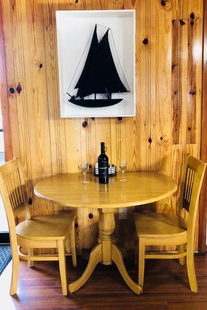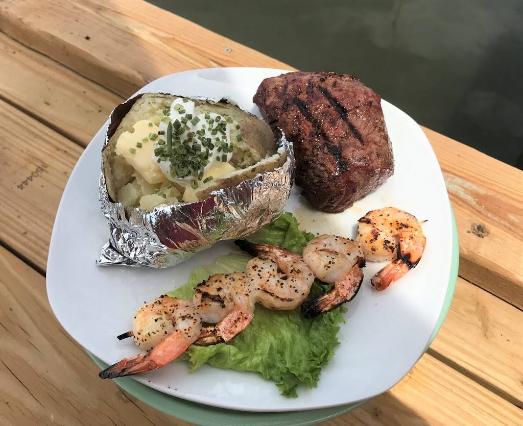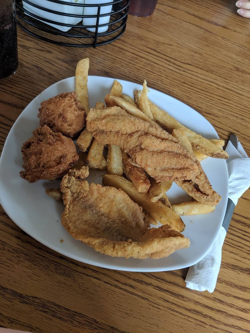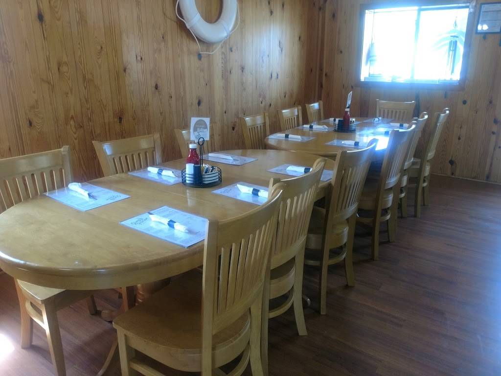 Service was good. Waitresses are friendly and helpful. Have eaten breakfast there and their Shipwreck omelet is delicious and big enough for two people. So we decided to take the boat over and have dinner. I had a hamburger (comes with chips - had to order fries at an extra $3.00). Bun was dry as was the hamburger - supposed to be 1/3 pound but more like 1/4# to me. Husband had their Seafood Basket with shrimp, fried clams, one piece of fish, coleslaw (if you like vinegar slaw they don't have it) and hush-puppies. Was all cooked too crispy for him. For what we got, it was pretty pricey. $31. (Oh, I did add a couple of ice cream sandwiches at $1.50 ea. for dessert.) Probably won't go there for dinner again.