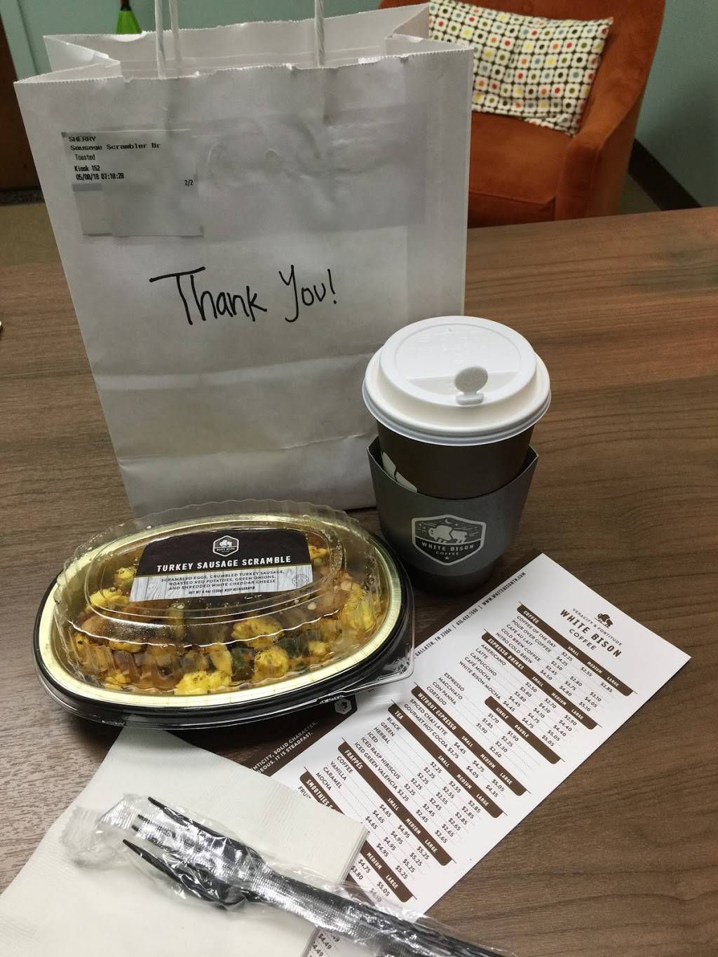 I love white bison. I always get the iced lattes but the coffees are great too. The staff is always friendly and I've never had a problem with any drinks or my order. It's convenient that it's inside twice daily as well.