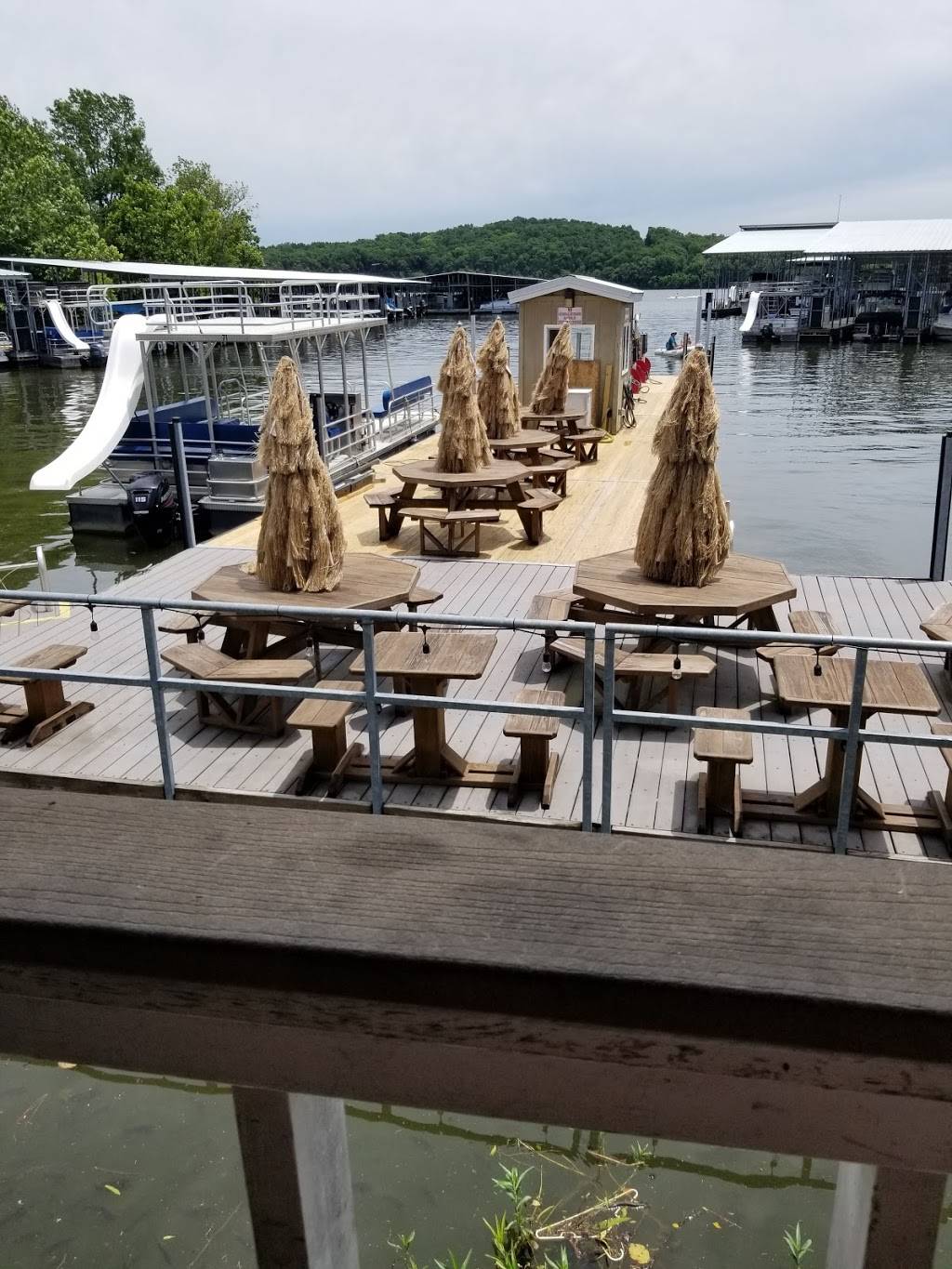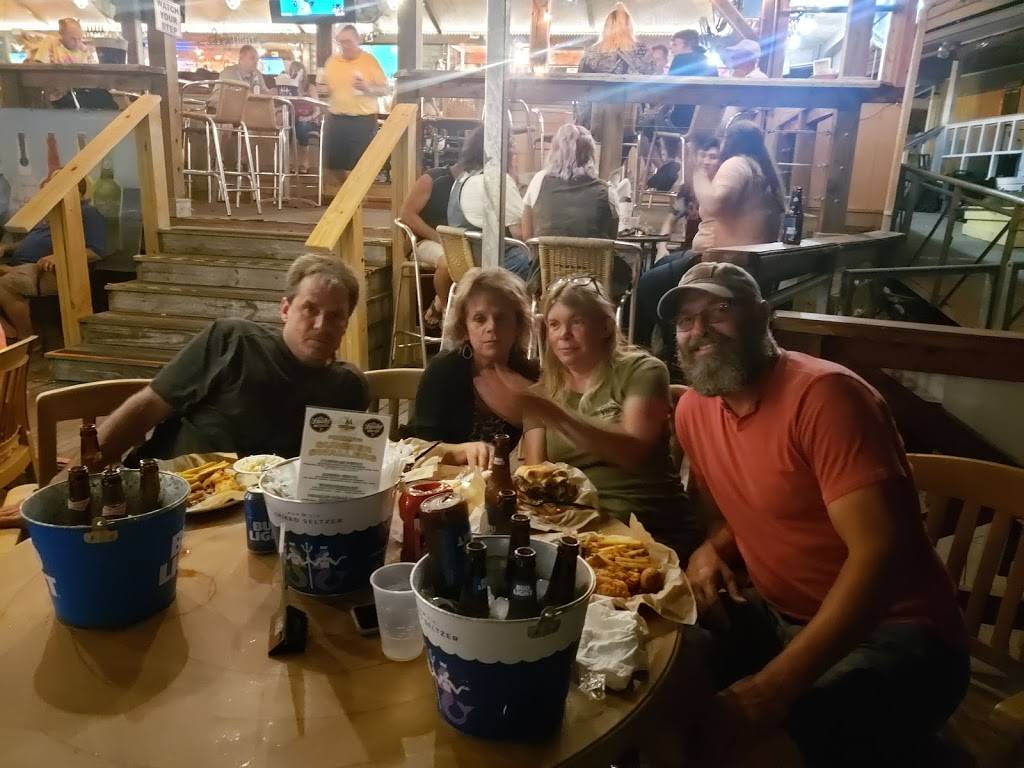 The bar is on the shore with ramps leading down to the dining area on a floating dock. They have pretty good food with the standard burger and beer menu. Very cool and casual laidback atmosphere with great live music.