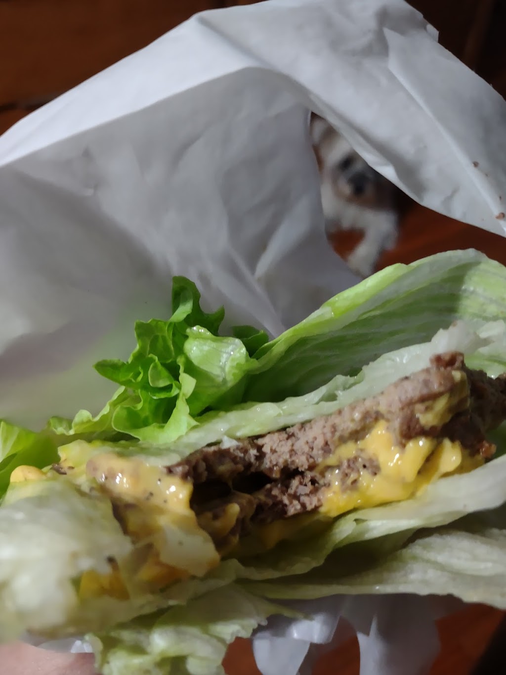 I'm so happy to have lettuce instead of a bun offered. The meat is tasty and nicely seasoned, salty. I am shocked at the size of the patties, smaller than most but the meat is better than any fast food place.