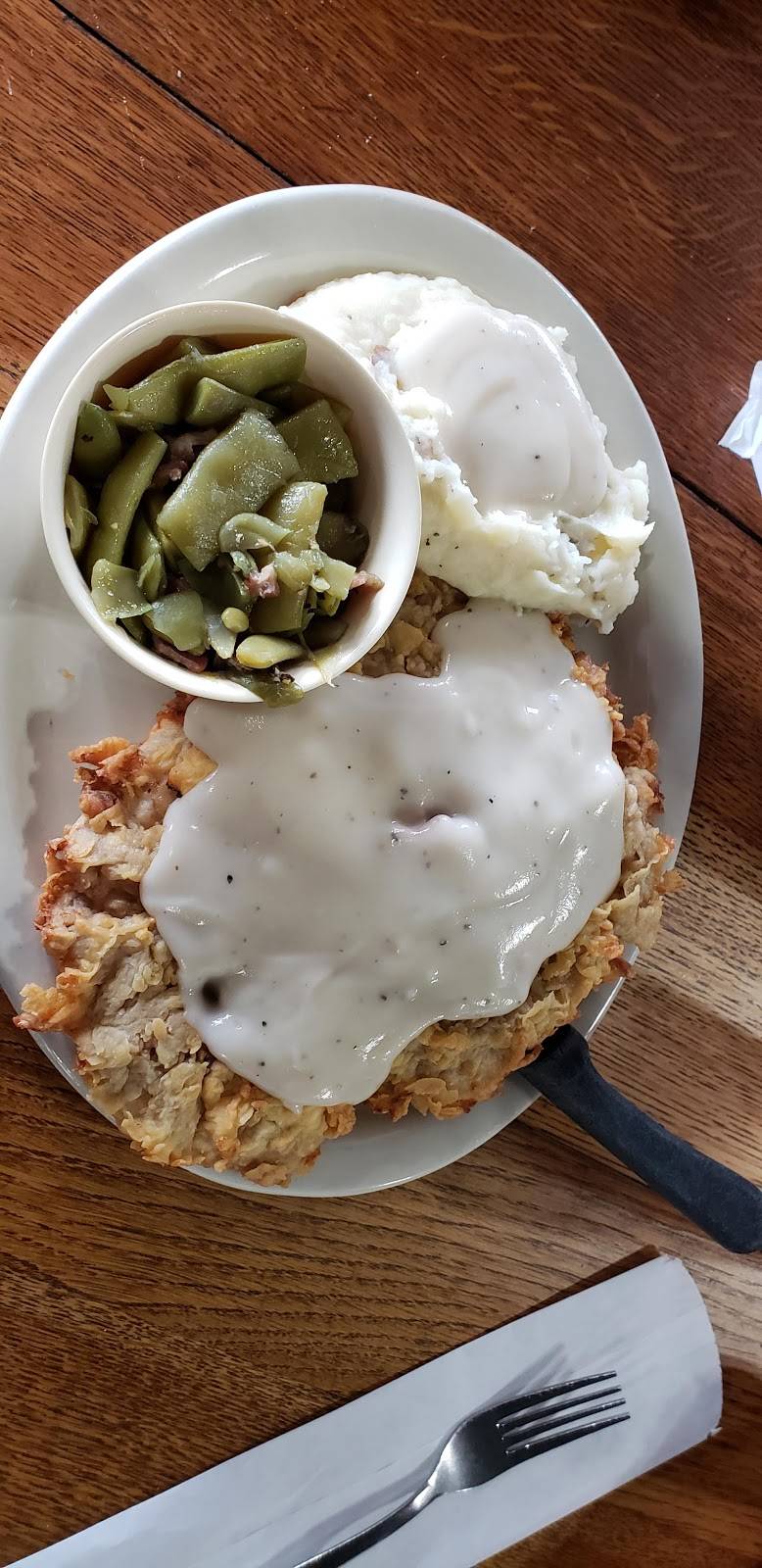 My son and I stopped here on our way through Burnet at 7 at night on a Tuesday. We ordered chicken fried steak with two sides and a baby spinach salad. The service was wonderful, the food was delicious and I highly recommend stopping here if you ever find yourself in Burnet. I also highly recommend the homemade peach cobbler a la mode as your dessert.