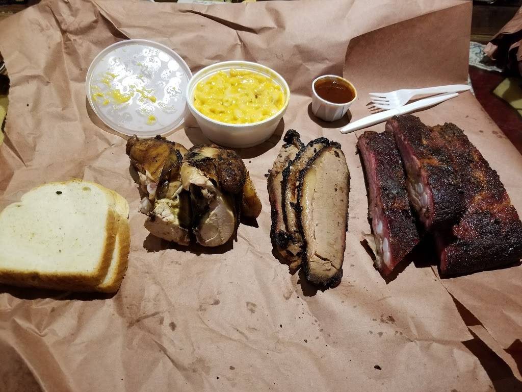 You order from the counter and pay by weight so the price isn't always exact. You can buy meat (brisket, ribs, sausage, chicken, etc.) and sides (coleslaw, potato salad, beans, etc.). They give you 2 slices of bread, but you can always ask for more.