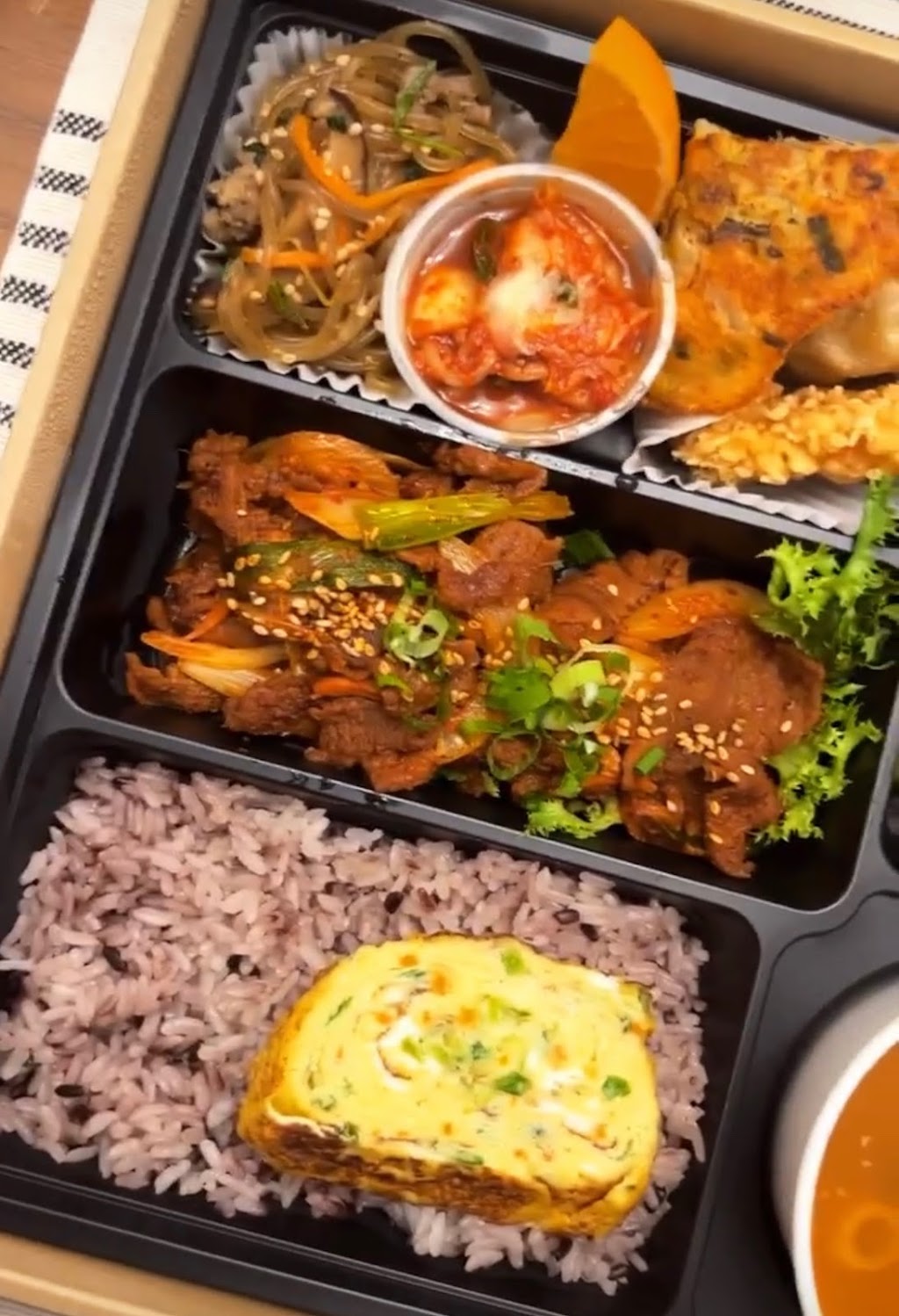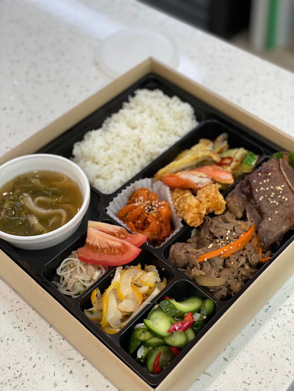 Stumbled upon this hidden gem by chance. I love hole in the walls. I ordered the special bento box with bulgogi. The togo bento box the food came in was so pretty it looked like a gift box. I guess you can say I gifted myself with a hearty savory meal. Lol It was so yummy I couldn’t stop eating it. Usually when I eat a lot I would start getting sleepy but I felt more energized after this meal. Very healthy too. They also sell a bunch of side dishes that you normally get at a Korean restaurant called Bonchan. I got the seaweed shrimp salad. Their pickled cucumbers and shishito peppers were delectable. Definitely going to go back and try their kimchi and other side dishes. Highly recommend! 😁