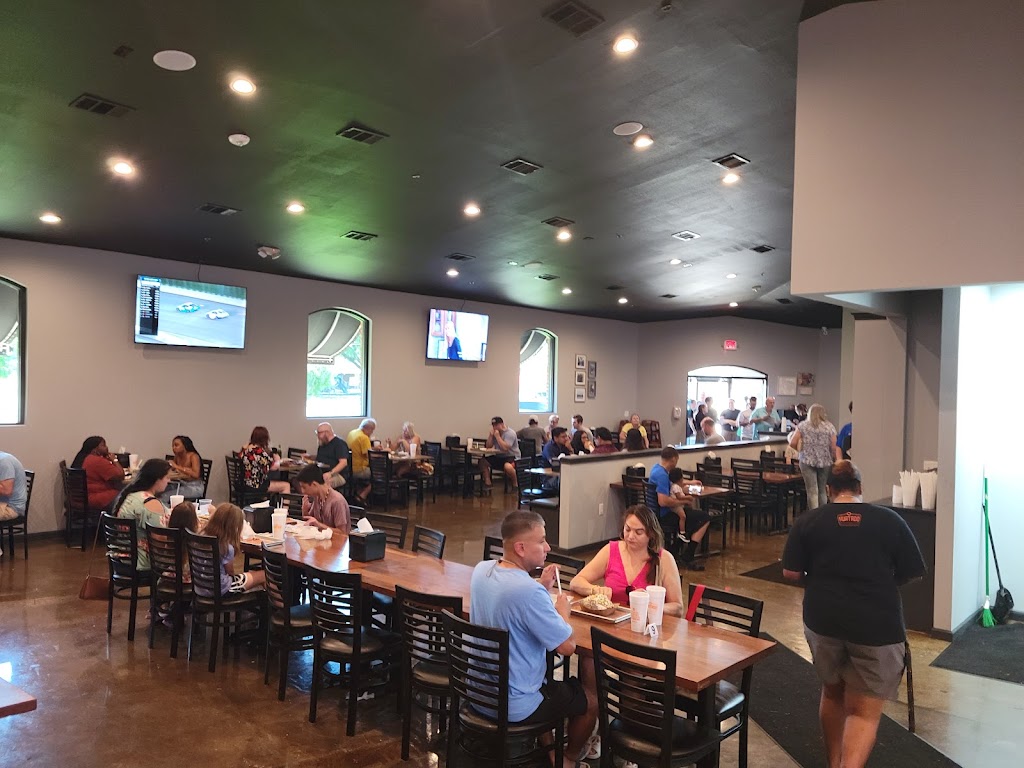 Three food is so good! The portions are really big! The barbecue sauce is really good too! It's just fabulous all around! It's always busy here! There is outdoor seating, but it's too hot to sit outside in the summer. There is a bar! There is no table service.