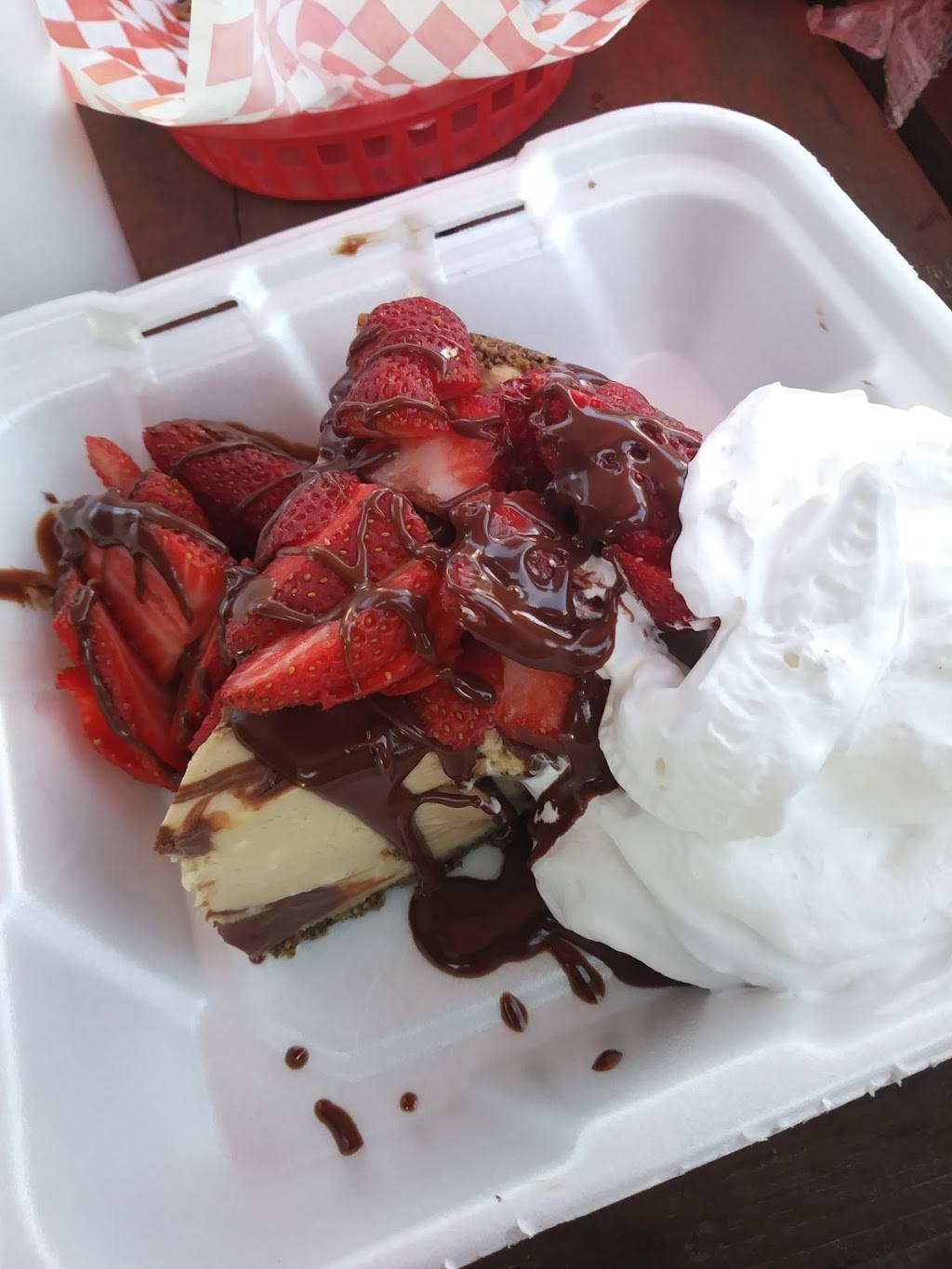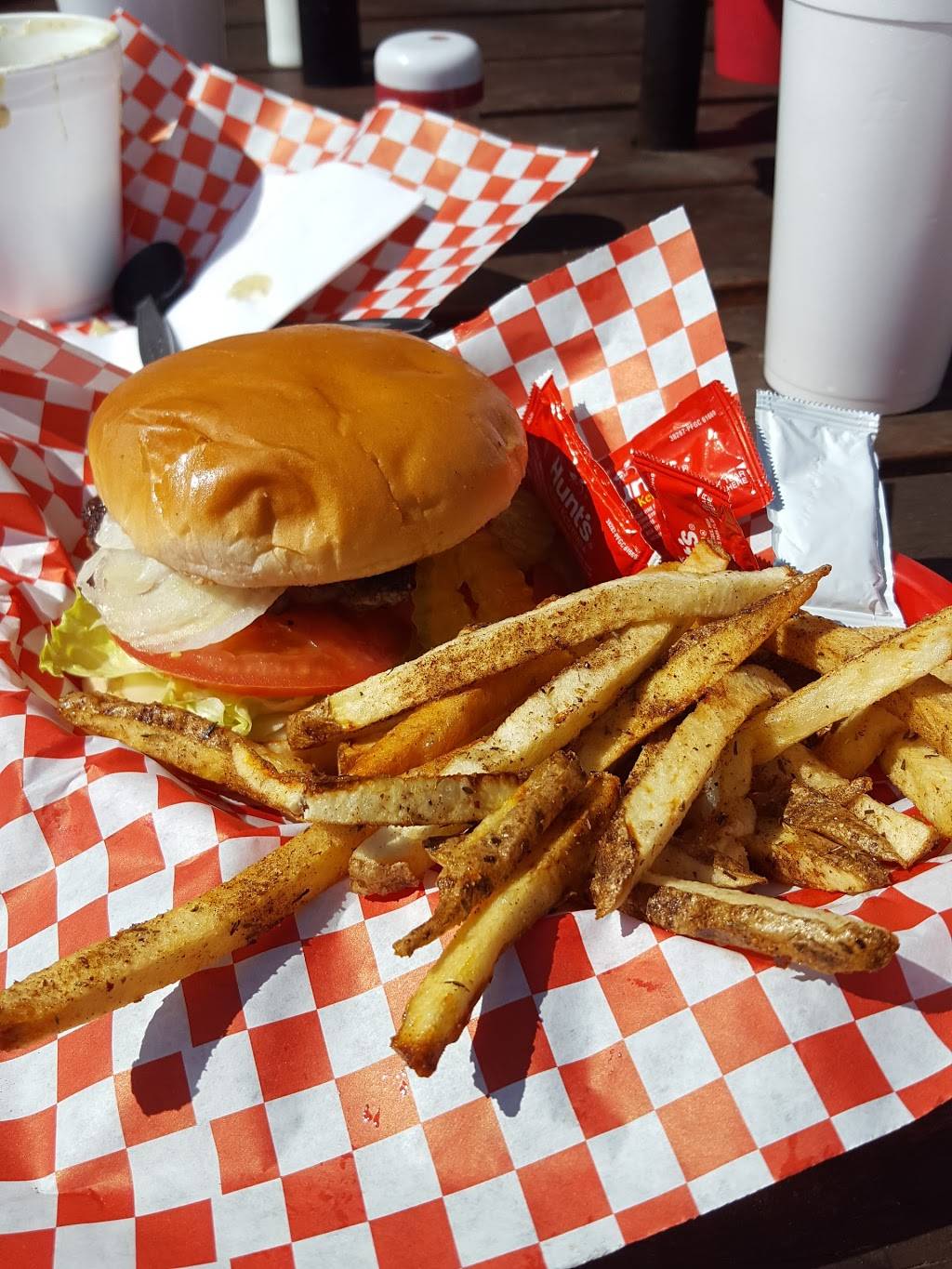 Great burgers and fries. Whole menu looks delicious. Great atmosphere with covered outdoor seating. The chef is extremely friendly, polite and an amazing cook. Don’t let the price of the cheesecake turn you off, it is worth every penny.