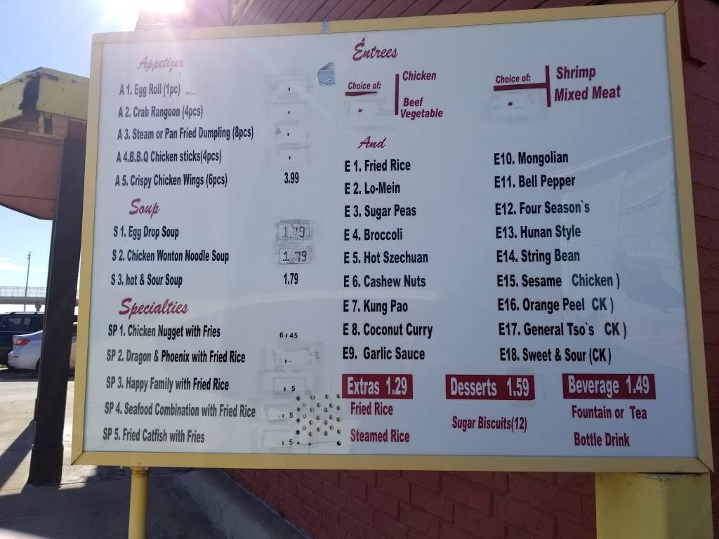 Average good at average prices. Slow service on drive through. Good for the area if you dont want to go into Denton. Lo Mine was average. Dumplings were below. Good serving sizes. Menu was a little difficult. See pic.
