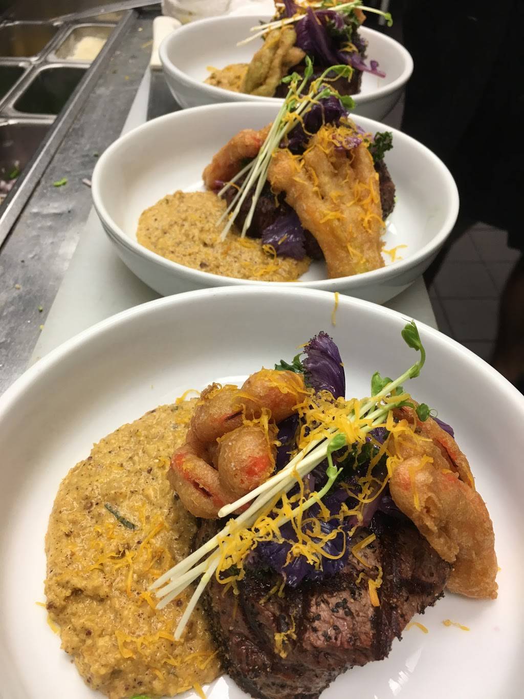 Great steak and Bourbon - frequent business traveler- I stayed at the hotel across the street. When I asked the hotel staff about this place, they didn't say anything bad, but didn't recommend the food. They were WRONG. Based on that info, I came in thinking I was only going to have a Bourbon. They do have a great selection, and I chose the Angels Envy. The staff was very friendly and described the steak special they had on Tuesday. It's off menu, sounded tasty, so I decided to go for it. Glad I did. Very well prepared, good cut of 10oz Tenderloin, and cooked perfectly. As previously stated, I'm a business traveler, in a dress shirt and jacket. Felt very comfortable here, with a good mix of customers. Amber and Haya at the bar were very friendly and helpful. Would definitely recommend this place.