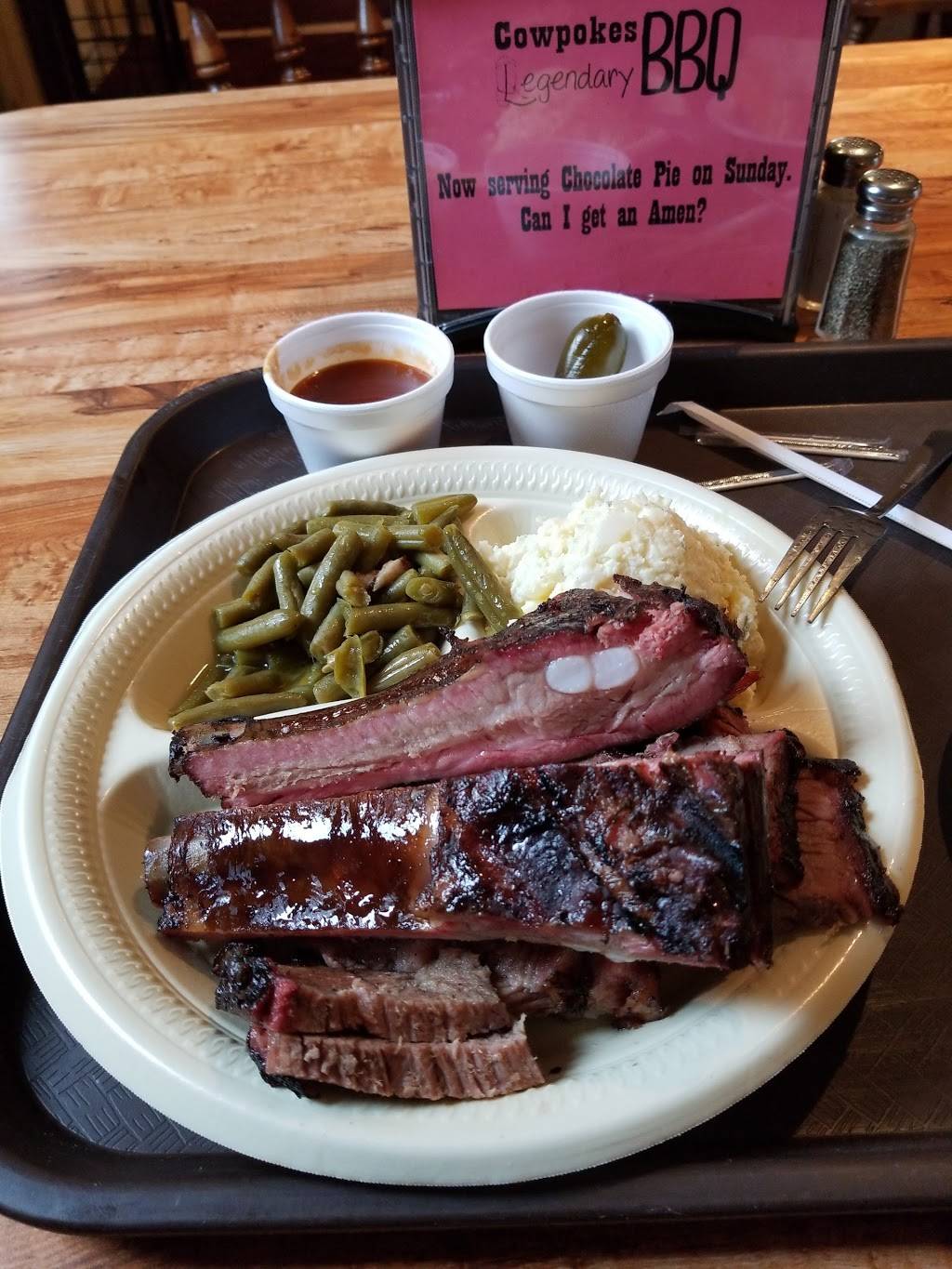 I really liked the bbq from cowpokes. I ordered large lean brisket and spicy sausage plate. The bbq sauce is good, but I wish they had a spicy sauce.