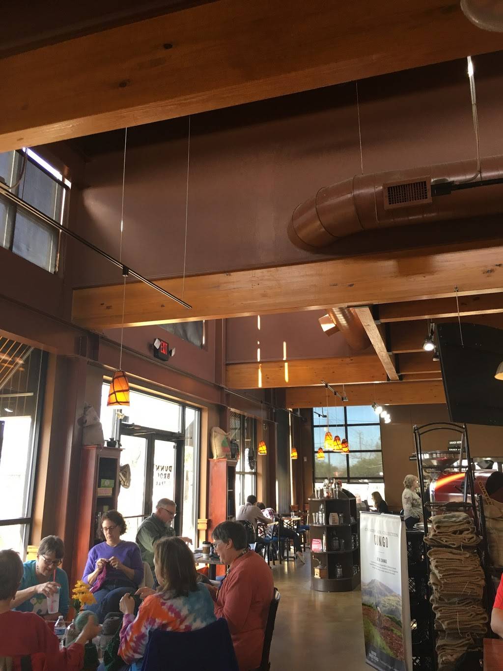 I just went here today with my group of friends and they had enough room for all of us to be close enough to talk to everyone with a little bit of rearranging the tables outside the coffee is great the sandwiches are the best I have ever had we liked the laid back vibe and great staff there too:) so if you are in town looking for a good place to hang out for a little while and get some good food and or coffee you should check out Dunn bros it’s all around a great little café :> 10 out of 10 would go again