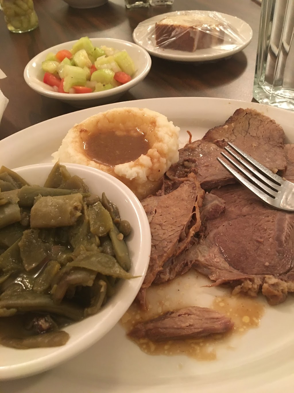 Great Sunday dinner type of food. Melt in your mouth meat. Great variety of veggies with a salad. Oh my, feel good food.