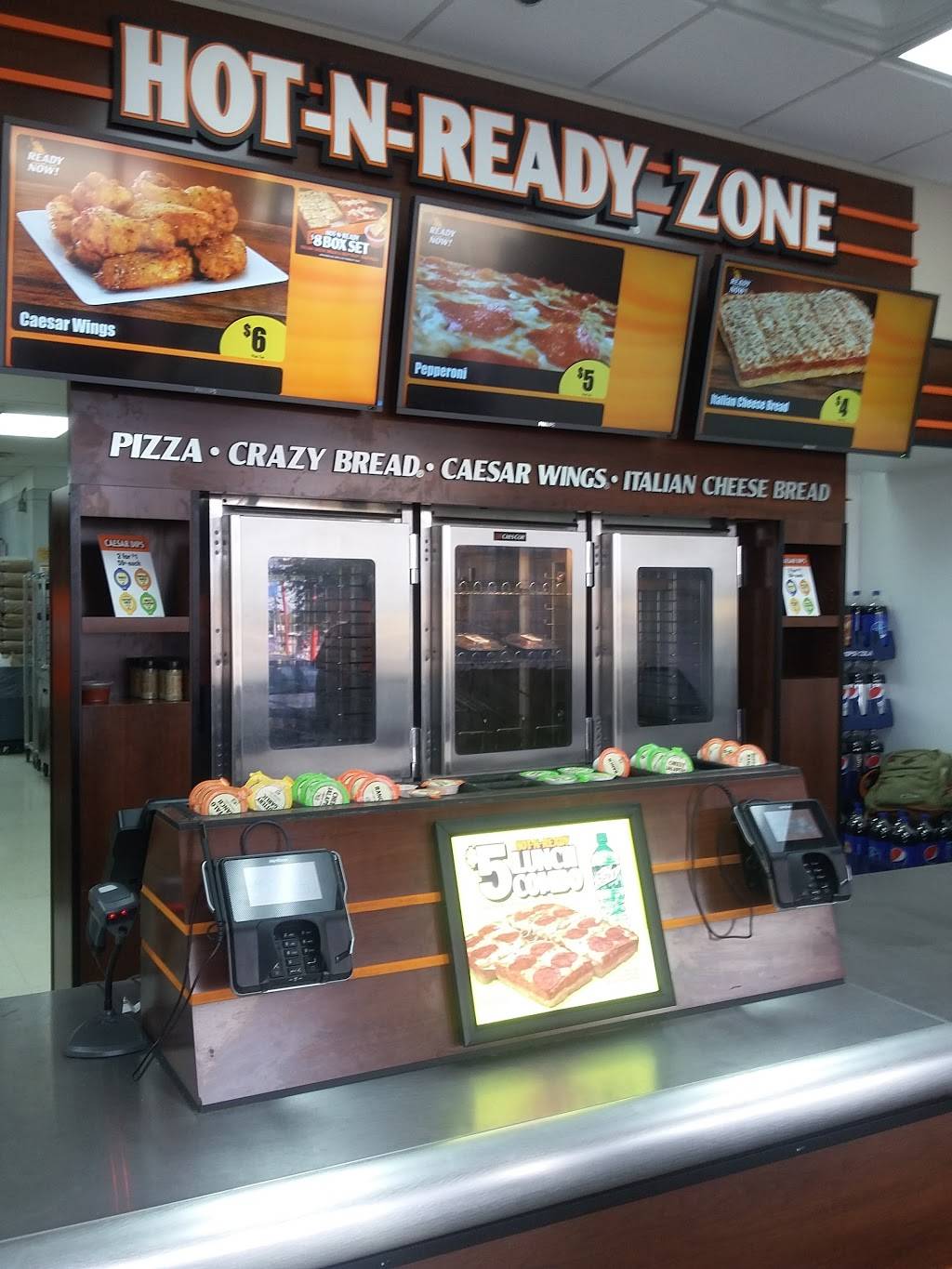 Little Caesars has amazing pizzas to eat and inside most have whole big things of soda in a refrigerator that you can buy