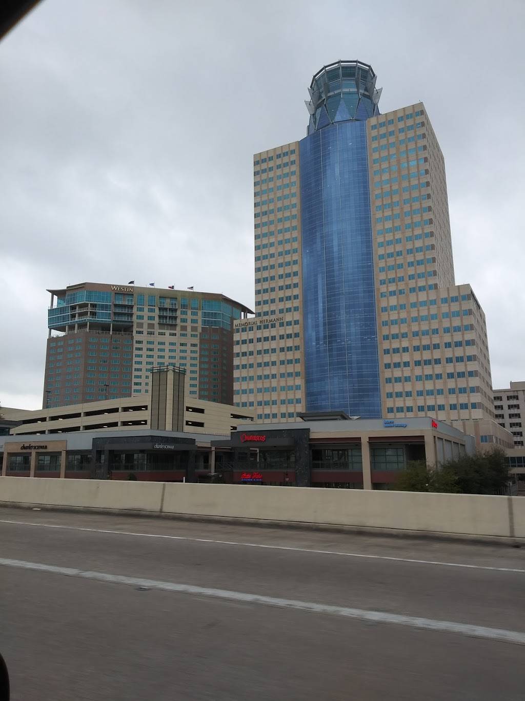 Modern/updated shopping center with hotel restaurants and a hospital. Suburban locale