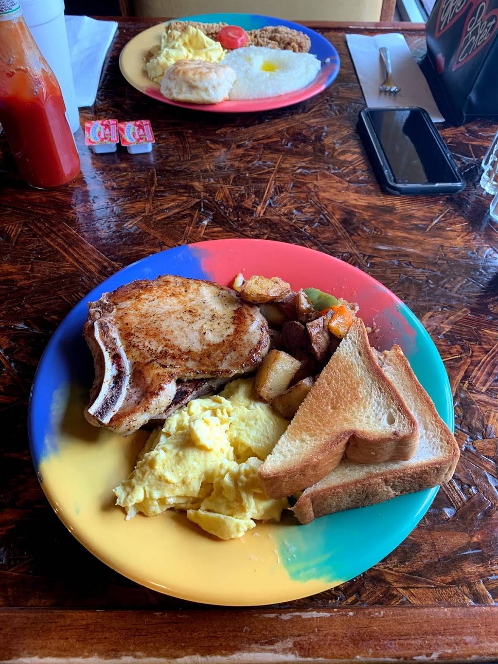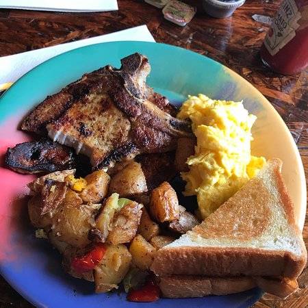 Line was long but it moved fast and the music and interactions with the staff helped the wait be more than tolerable. Every staff member I spoke with had a good, welcoming personality, like they actually liked their jobs. More importantly though, the food was DELICIOUS. I had the meaty omelet with potatoes and a biscuit, french toast and fried pork chops. Also lemonade was so good and refreshing, though a little too sweet for my taste. I will definitely be returning soon.