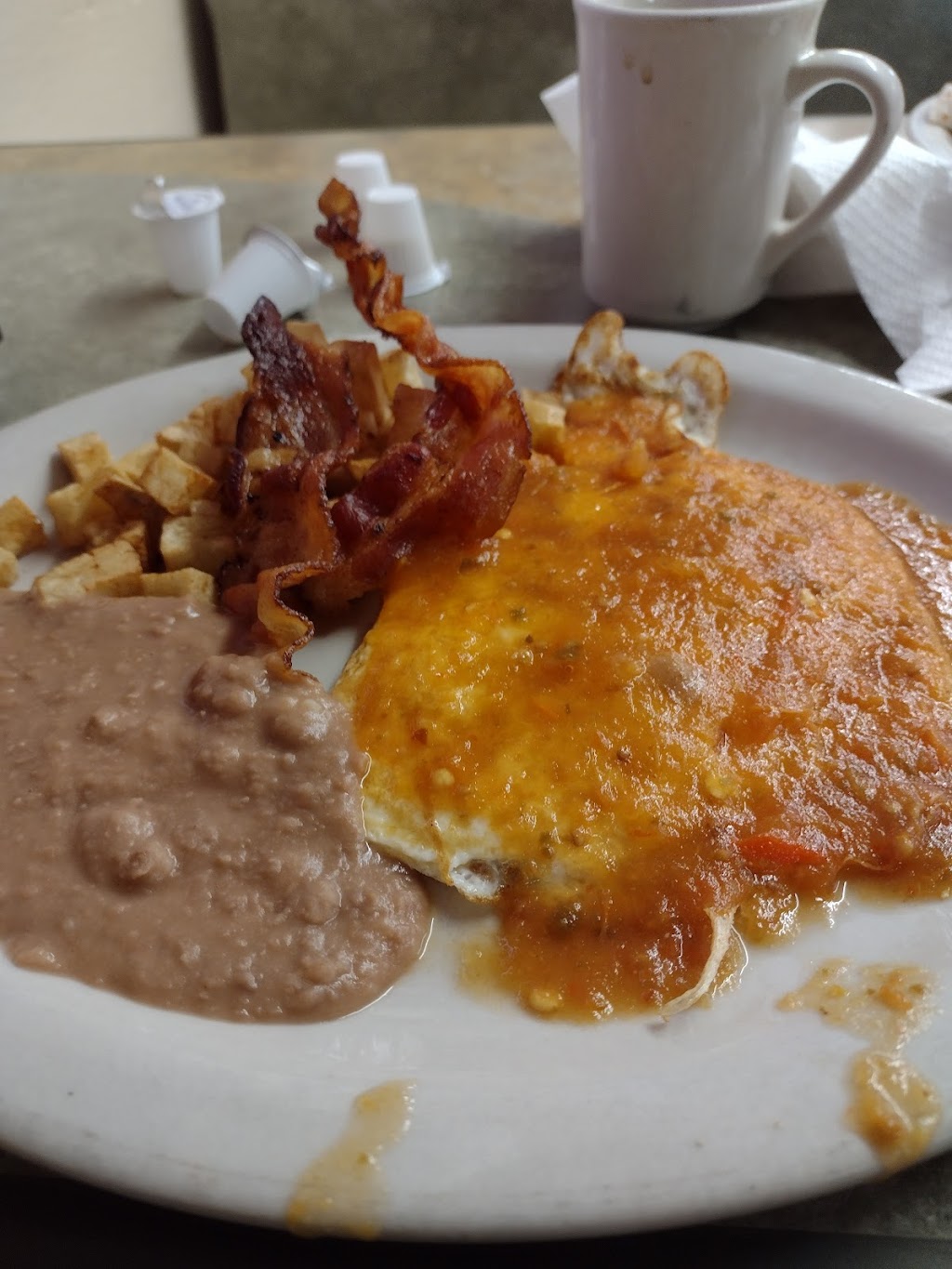 The eggs were cooked perfectly, the salsa was tasty but the cook barely put any salsa on the eggs you can see how dry it looks.the bacon was thin and crispy, the potatoes were made fresh but tasteless, the refried beans were okay.