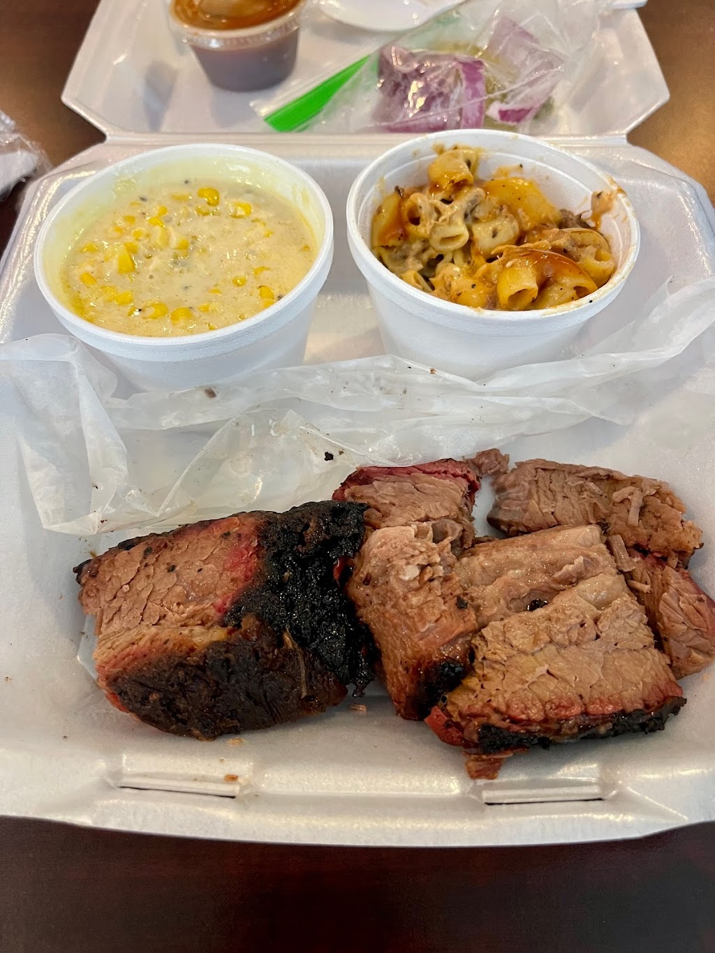 First time here. I got the brisket plate with Mac and cheese and corn. The brisket was moist and tender with great flavor. The mac and cheese had brisket in it and it was amazing. Definitely will be going back. The gentleman and women there are super nice with great customer service!