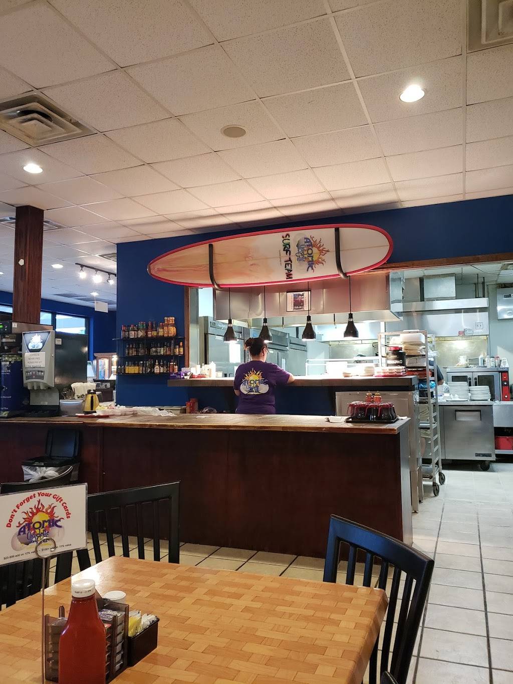 Nice Little Brunch Stop! You have to order up front first. They do have a chalkboard menu hung above the registers, but for those of us who use readers will be glad to know they have 2 large print binder menus to flip through. Once you order you'll get a number and seat yourself in the dining room. FYI: You get your own drinks, (we waited 15 minutes before we realized everyone was serving themselves. All drinks are around the counter away from the registers. If you ordered milk or juice it is up beside the registers. They bring your food out. You refill your own drinks. (Another occurrence we weren't told about.) But, in all it was a great place to go and the food was good, came out fast and piping hot.