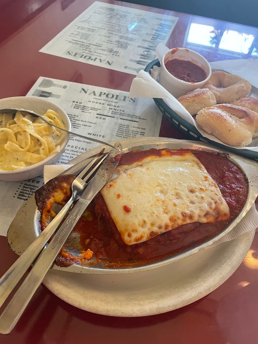 I like the garlic bread twists. I ordered the lasagna for my entrée. It was fresh, cheesy, and good. My friend had the Penne Ala Vodka. (Delicious! 😋 I'm ordering it next time.)