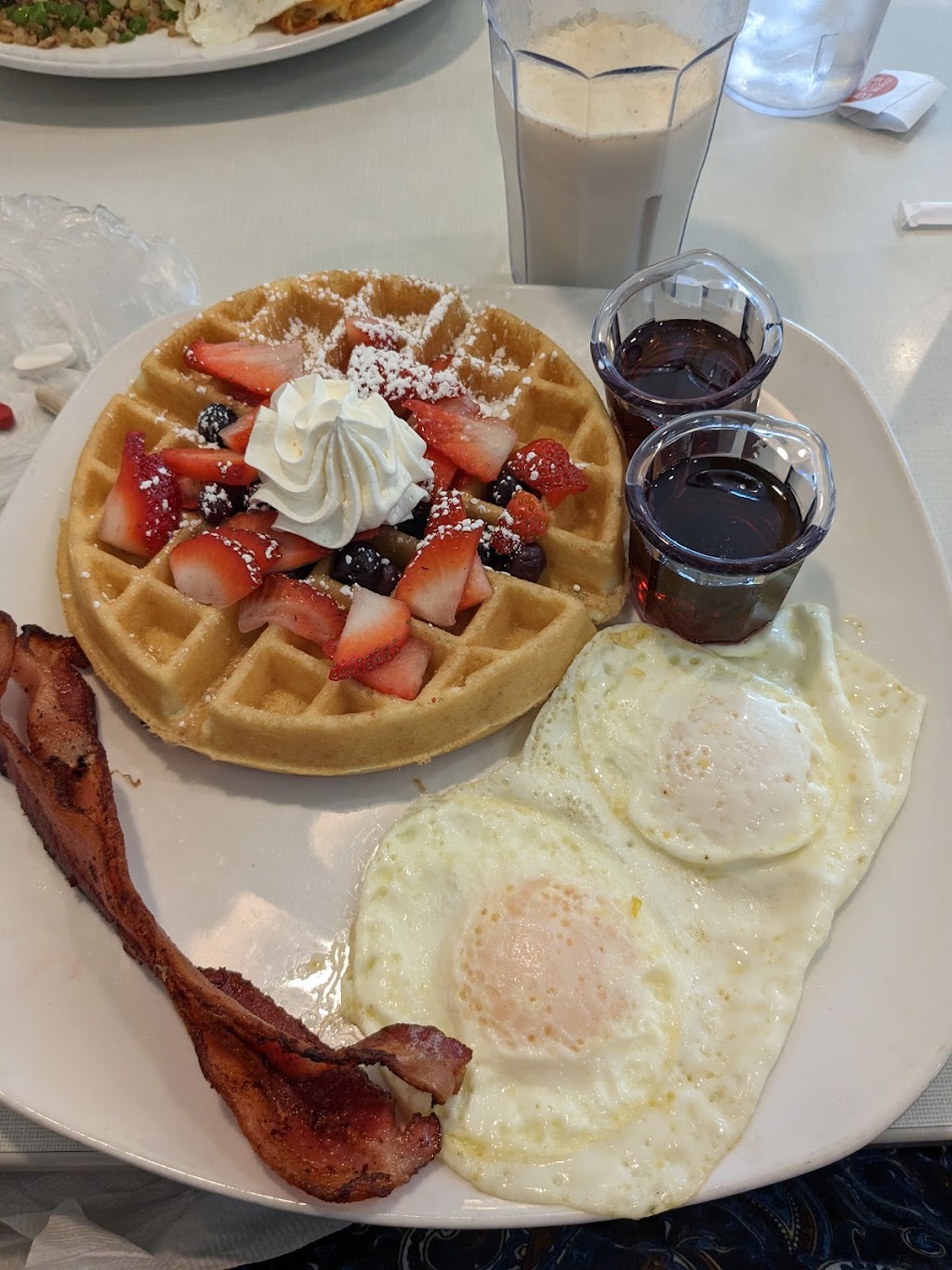 Garbage Breakfast about 7 out of 10. One of the best biscuits I've ever eaten. Gravy was not the best. The very very Belgium waffle combo was good. I had the slow smoked bacon. Very tasty but I think the waffle could have stayed on the griddle a little longer. I like mine crispy and it was pretty soggy and soft. The fruit was sliced strawberries. Didn't quite look like the picture.