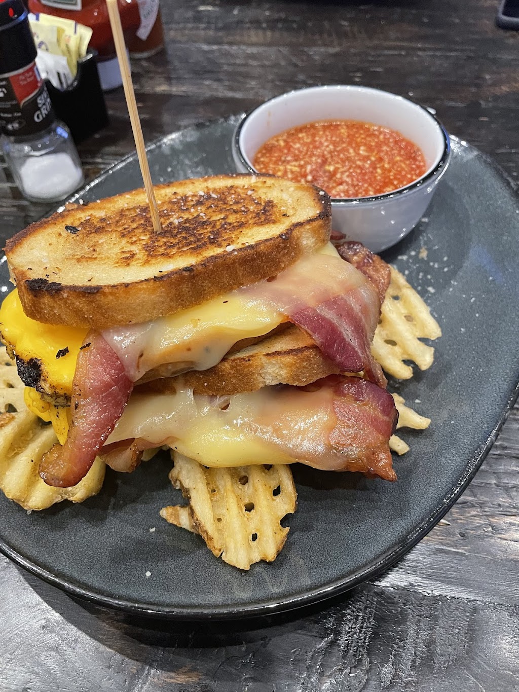 Food was great. Grown up grilled cheese with a bowl of very tasty marinara for dipping. So good! Wife had shrimp tacos. Very yummy. Prices were on par with a chain restaurant. Will go back again.