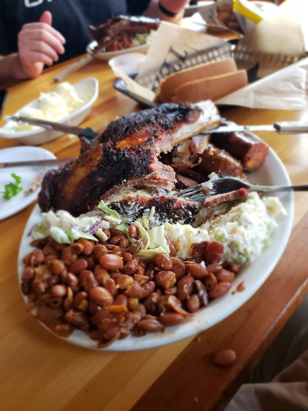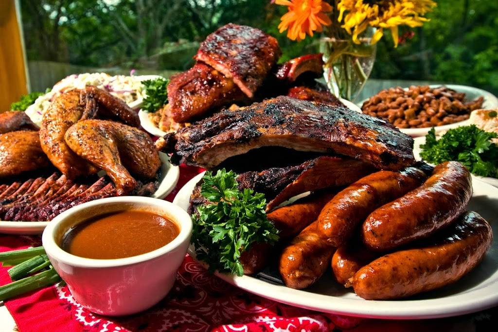 Don't be scared away by a full parking lot. The restaurant is larger than it appears on the outside. Then, you walk into a very cozy area, nicely decorated with country style artifacts. The meats are all amazing I have no favorites but, I particularly like the potato salad and the bread. The prices are accessible, you could share if you're not too hungry. The waiters are very corteous and fast. After your meal, you can go on the deck and feed the gorgeous carp on the river. Food is available for $0.25 a cup. A friendly reminder, don't throw away the cup on the ground when done. Enjoy your visit!