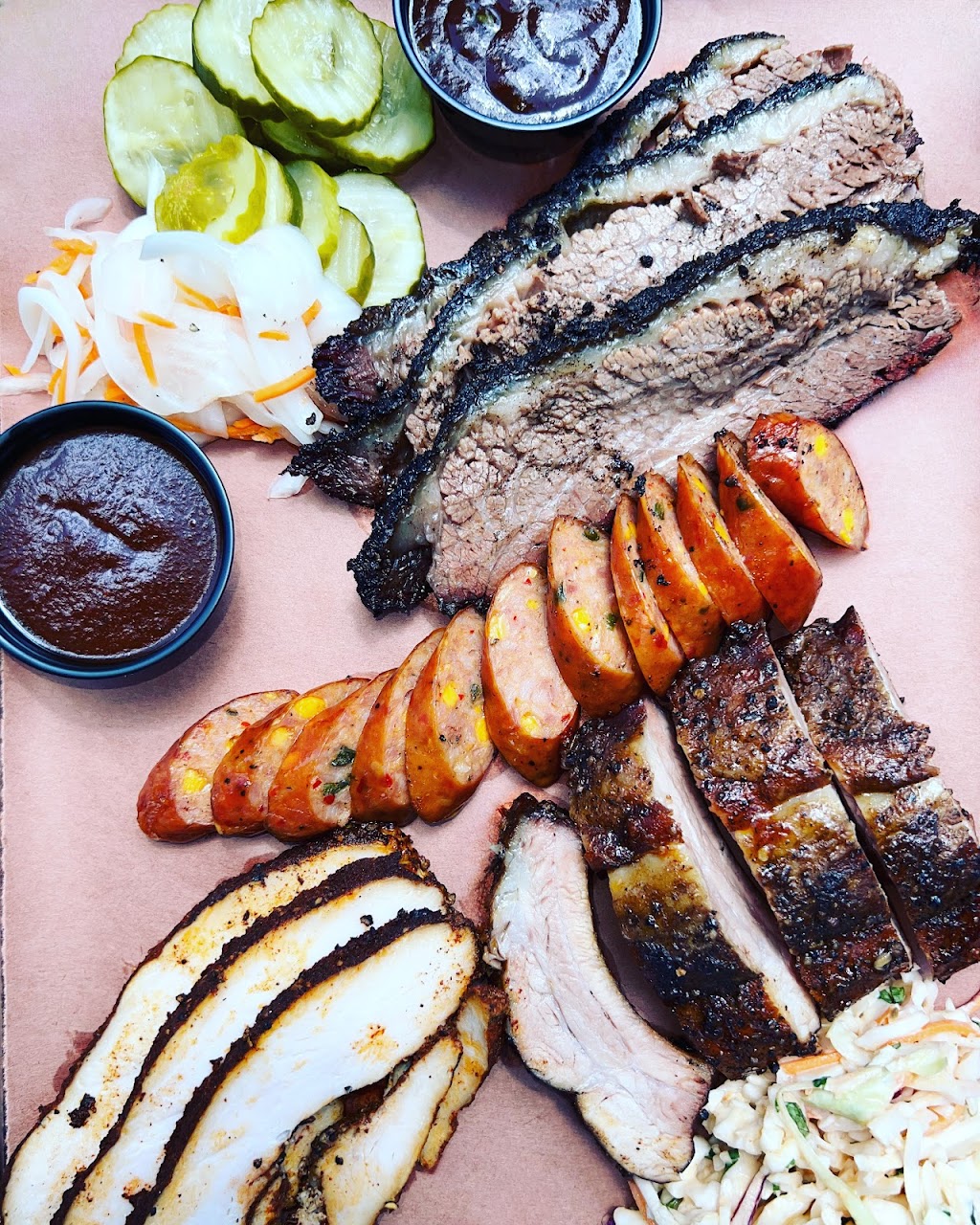 Man oh man Jim is gonna put the other bbq places around here out of business. We bought two plates to try a little of everything (sausage, brisket, turkey and the baby backs with green chili corn, scallop potatoes, pinto beans and the sriracha slaw) and every last thing was sooooo good! The baby backs and beans are to die for!!! I missed the mac and cheese but will definitely be back again to try it!